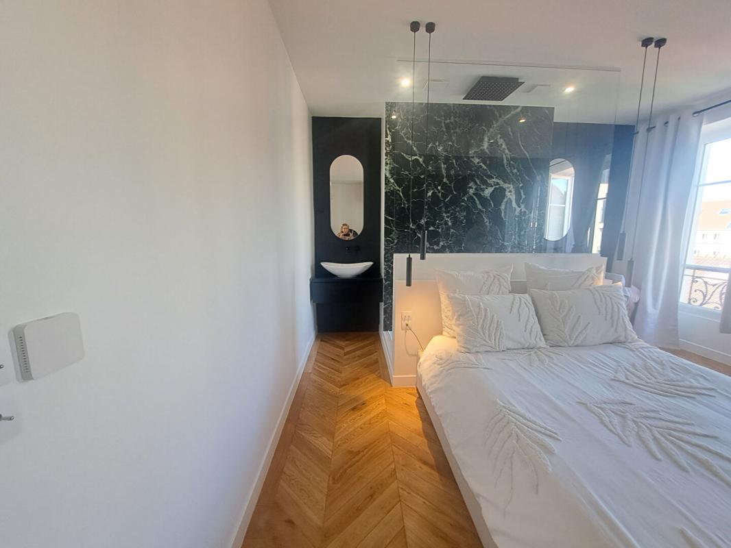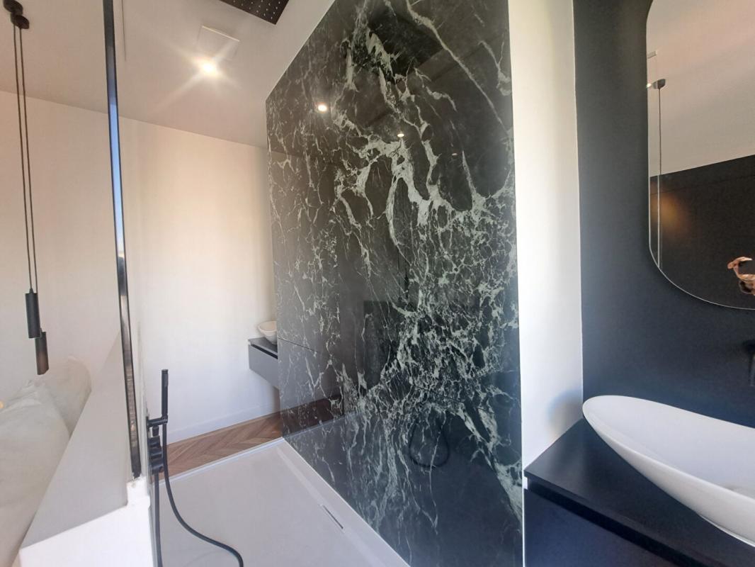 ouverte sur une cuisine américaine. La chambre est complétée par une salle d'eau faîte avec des matériaux de qualité et une conception originale. WC séparés . Le sol est fait avec un parquet massif pointe de Hongrie.