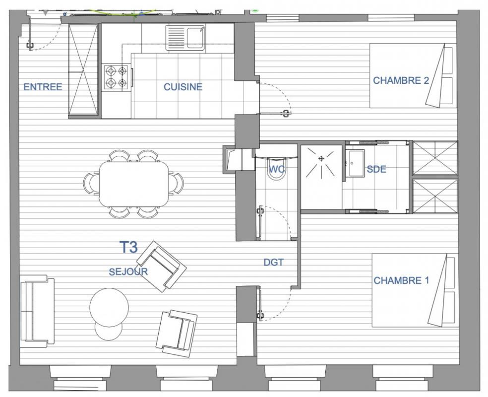 Il se compose d'une vaste pièce de vie exposée plein sud avec cuisine ouverte, plan de travail en inox, rangements sur-mesure , 2 chambres , 1 SDB, 1WC indépendant et un plan parfaitement optimisé sans perte d'espace.