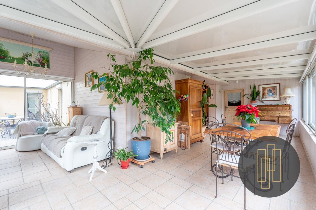 Au rez-de-chaussée, la cuisine est ouverte sur la pièce de vie, elle même prolongée par une véranda avec de nombreuses baies vitrées pour un maximum de lumière.