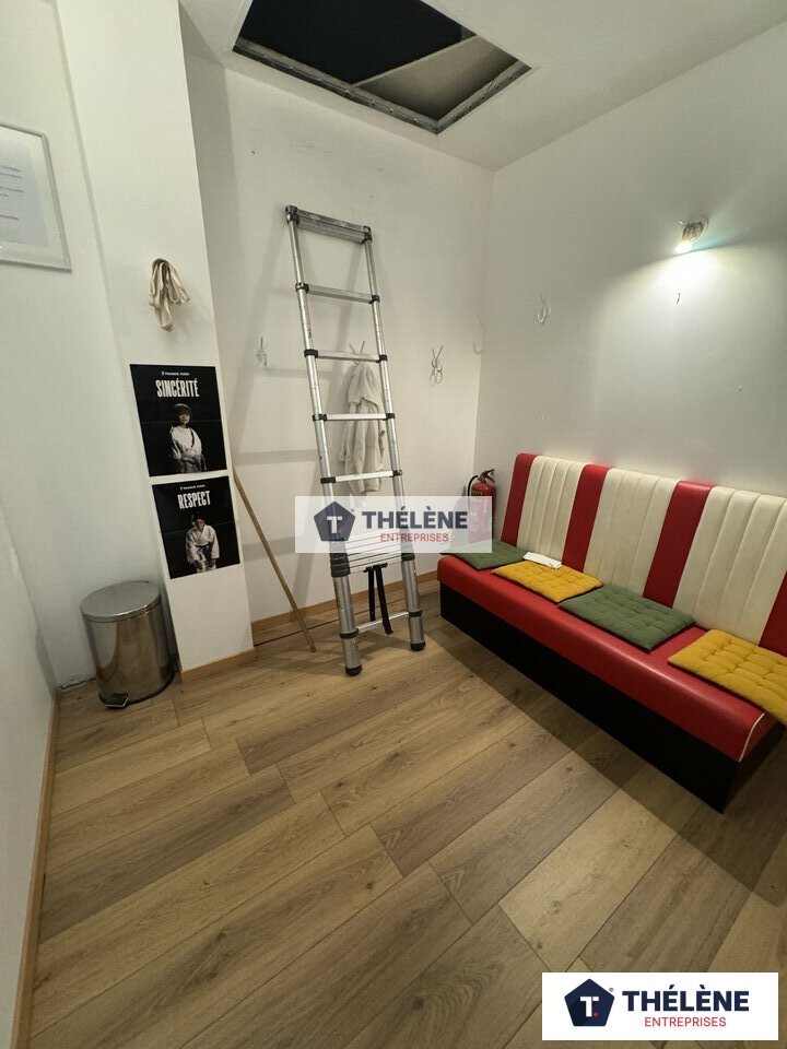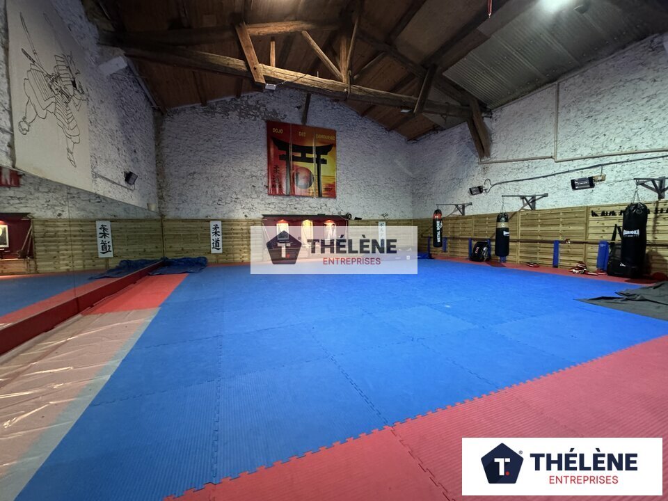 Une grande salle de 140 m² (actuellement dojo) avec hauteur sous plafond d'environ 7 m et poutres apparentes