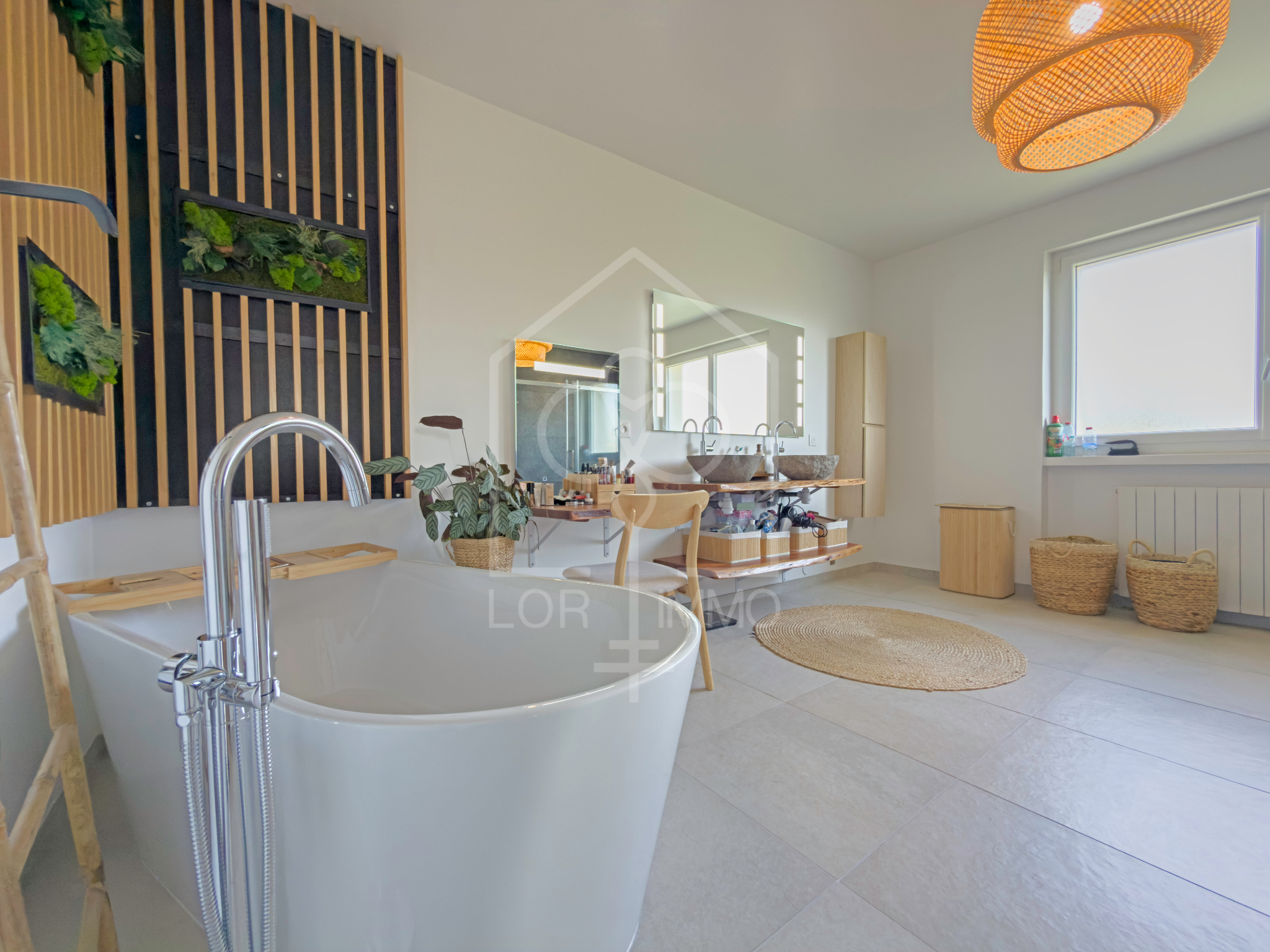 Spacieuse et splendide salle de bains avec double vasque, baignoire îlot et double douche