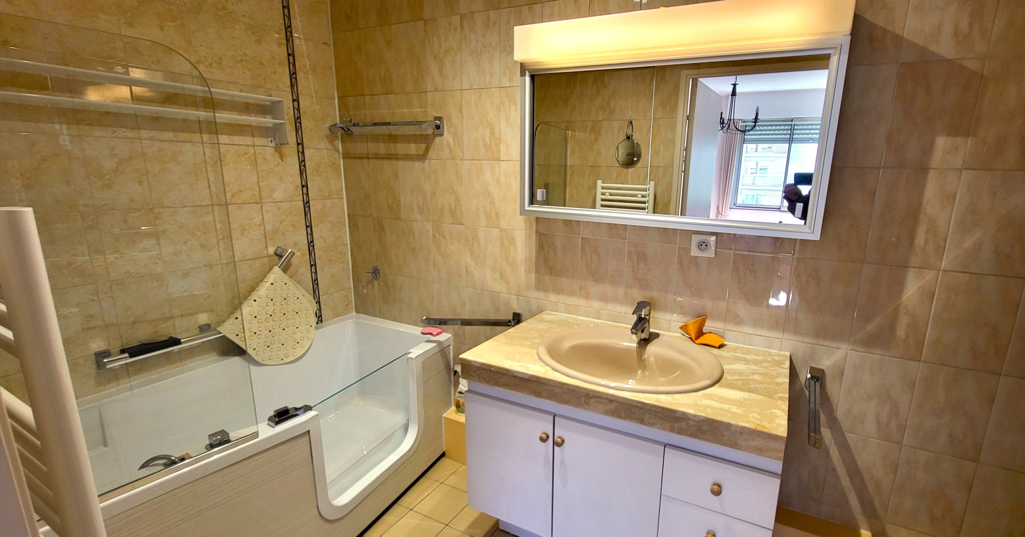 Salle de bains avec Baignoire à porte / douche + meuble vasque.