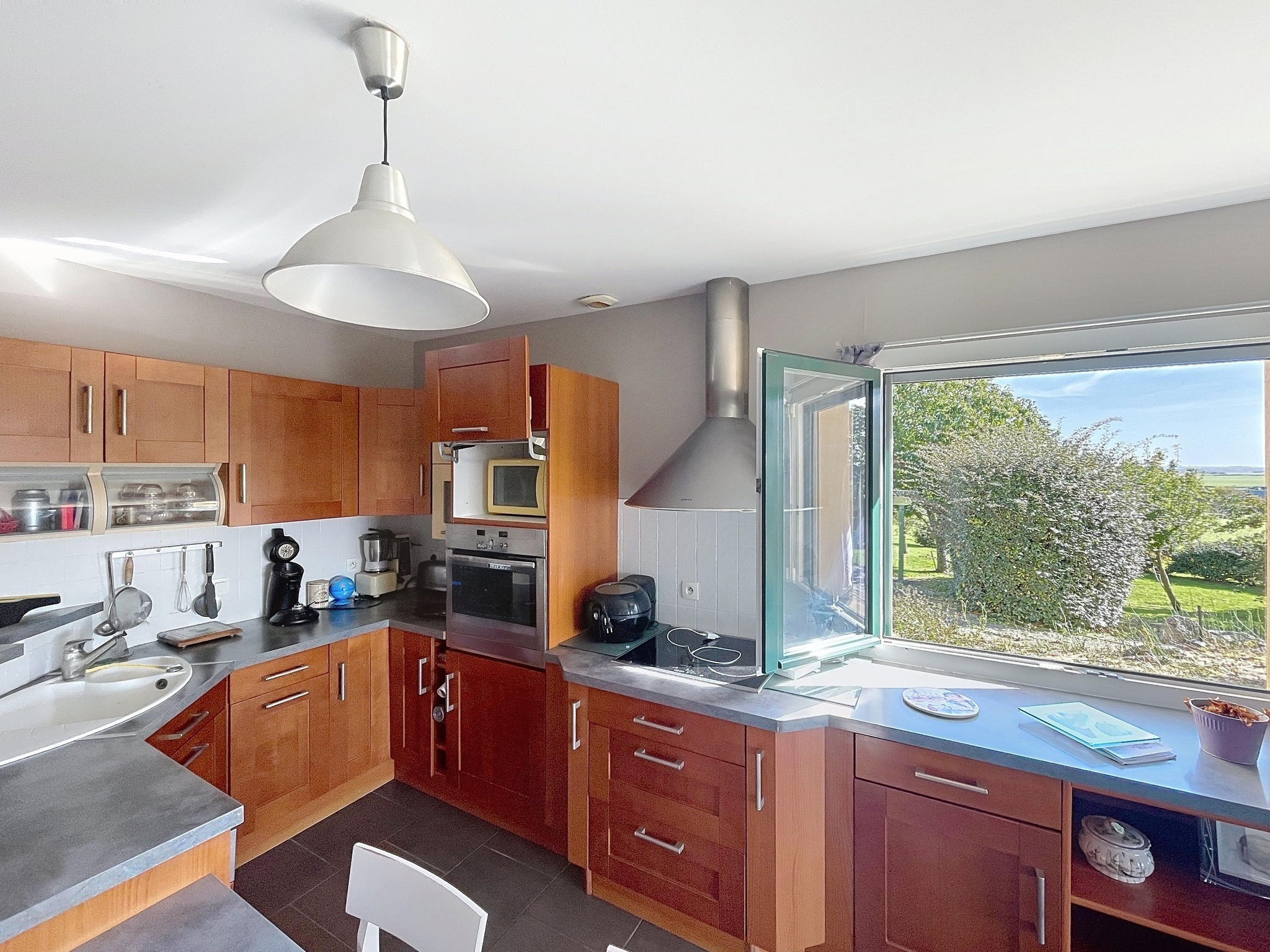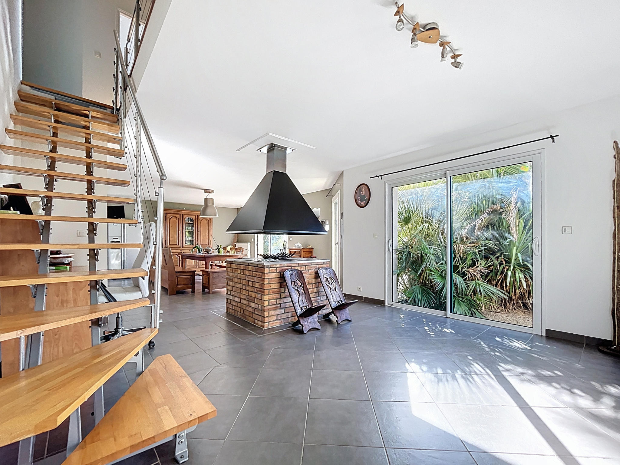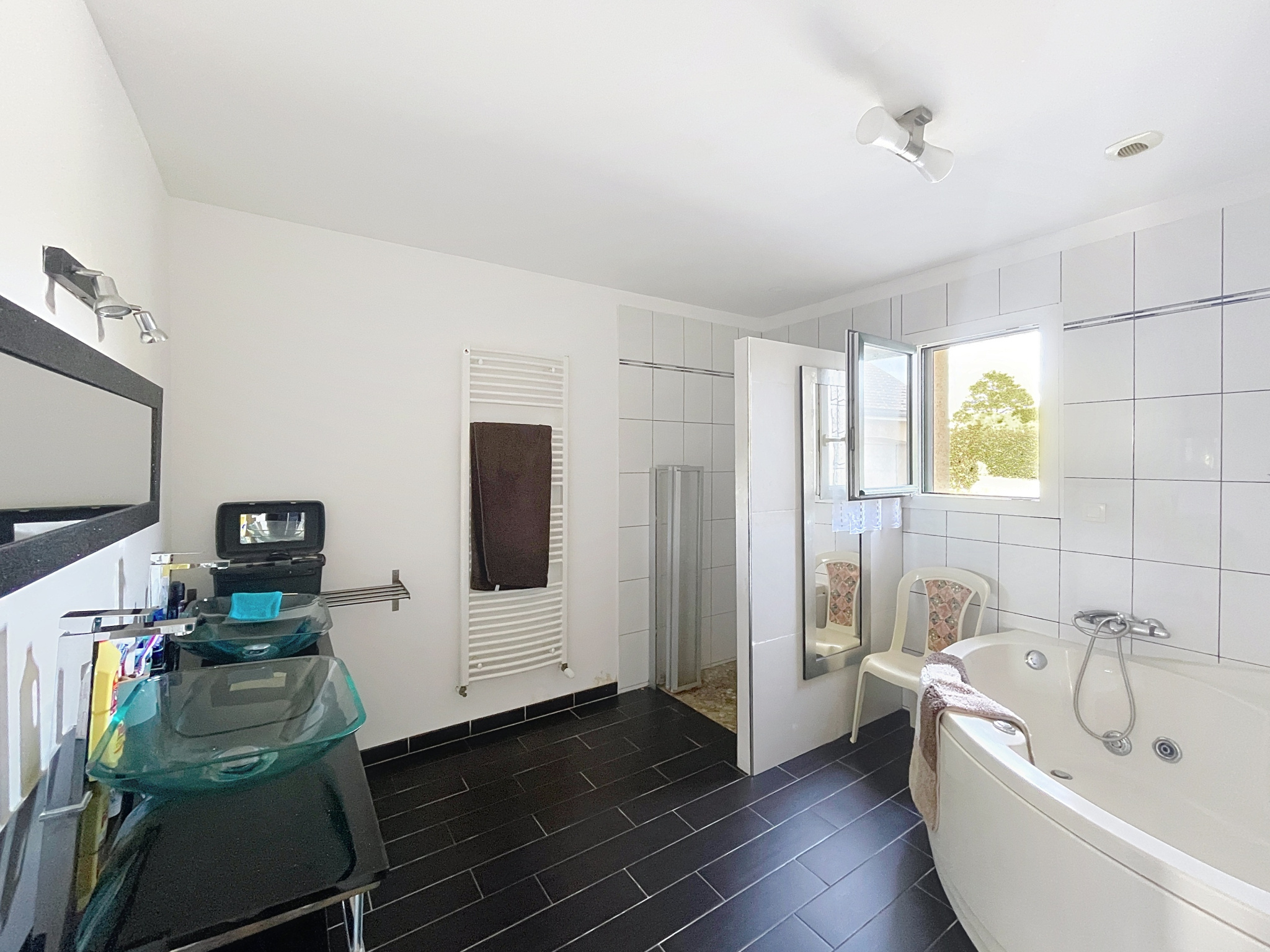 Dès l'entrée, vous serez séduits par la luminosité et la fluidité des espaces, notamment grâce à une vaste pièce de vie de 80 m2 comprenant un salon-séjour convivial et une cuisine ouverte entièrement équipée, le tout largement ouvert sur l'extérieur grâce à de grandes baies vitrées. La vie de plain-pied est facilitée par la présence d'une chambre au rez-de-chaussée ainsi que d'une salle de bain spacieuse comprenant une douche à l'italienne et une baignoire, offrant ainsi un confort optimal pour toute la famille.
