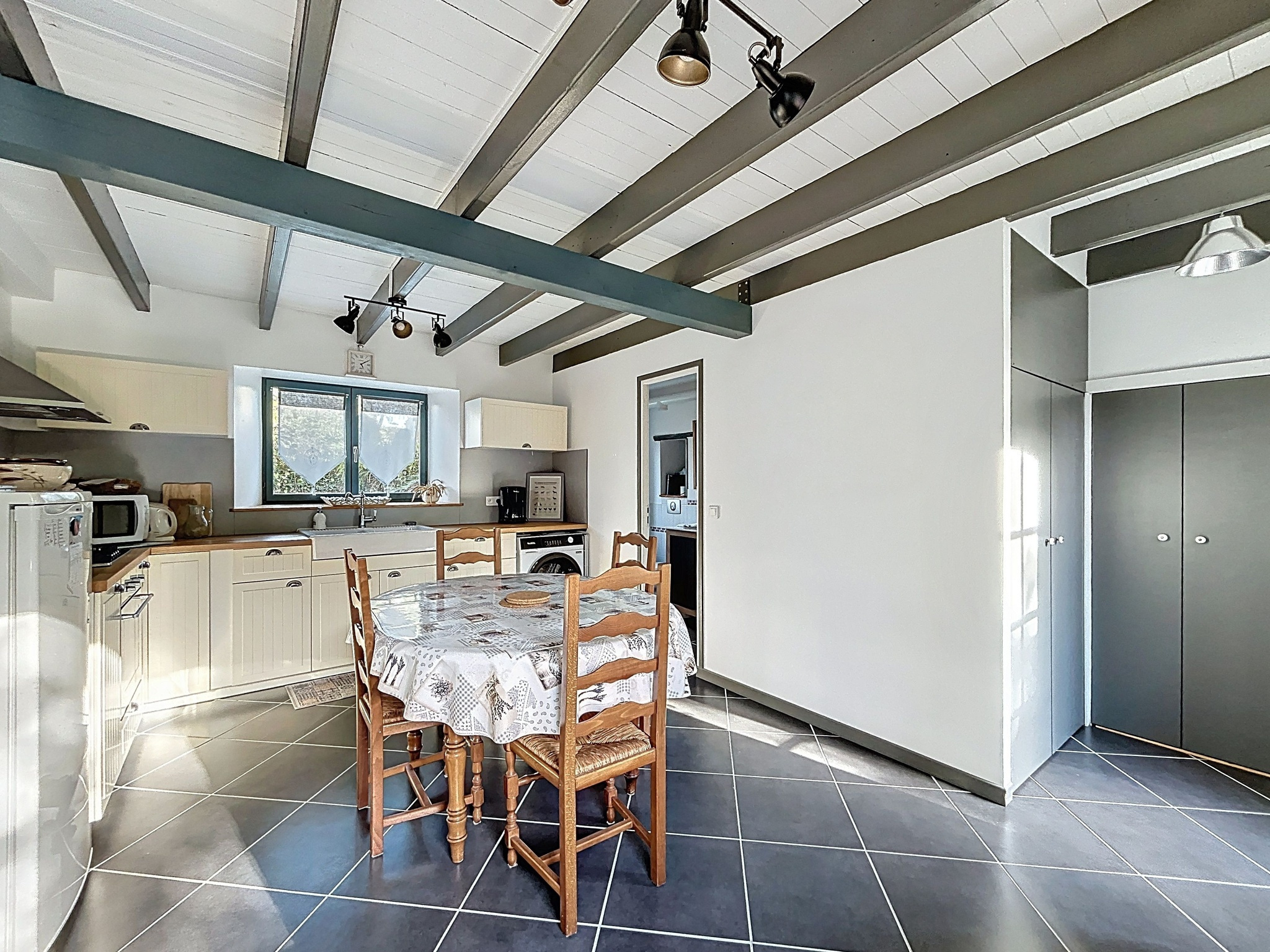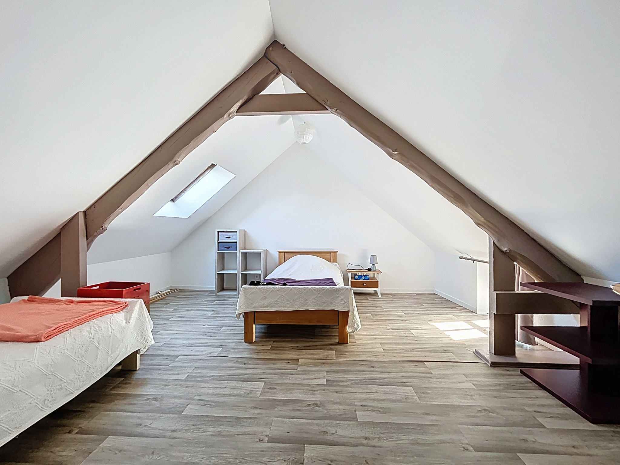 Elle se compose au rez-de-chaussée d'un agréable salon/séjour agrémenté d'un poêle à bois, d'une cuisine aménagée et équipée, ainsi que d'une salle d'eau avec WC. À l'étage, un palier dessert deux chambres mansardées, idéales pour une famille ou pour accueillir des invités.