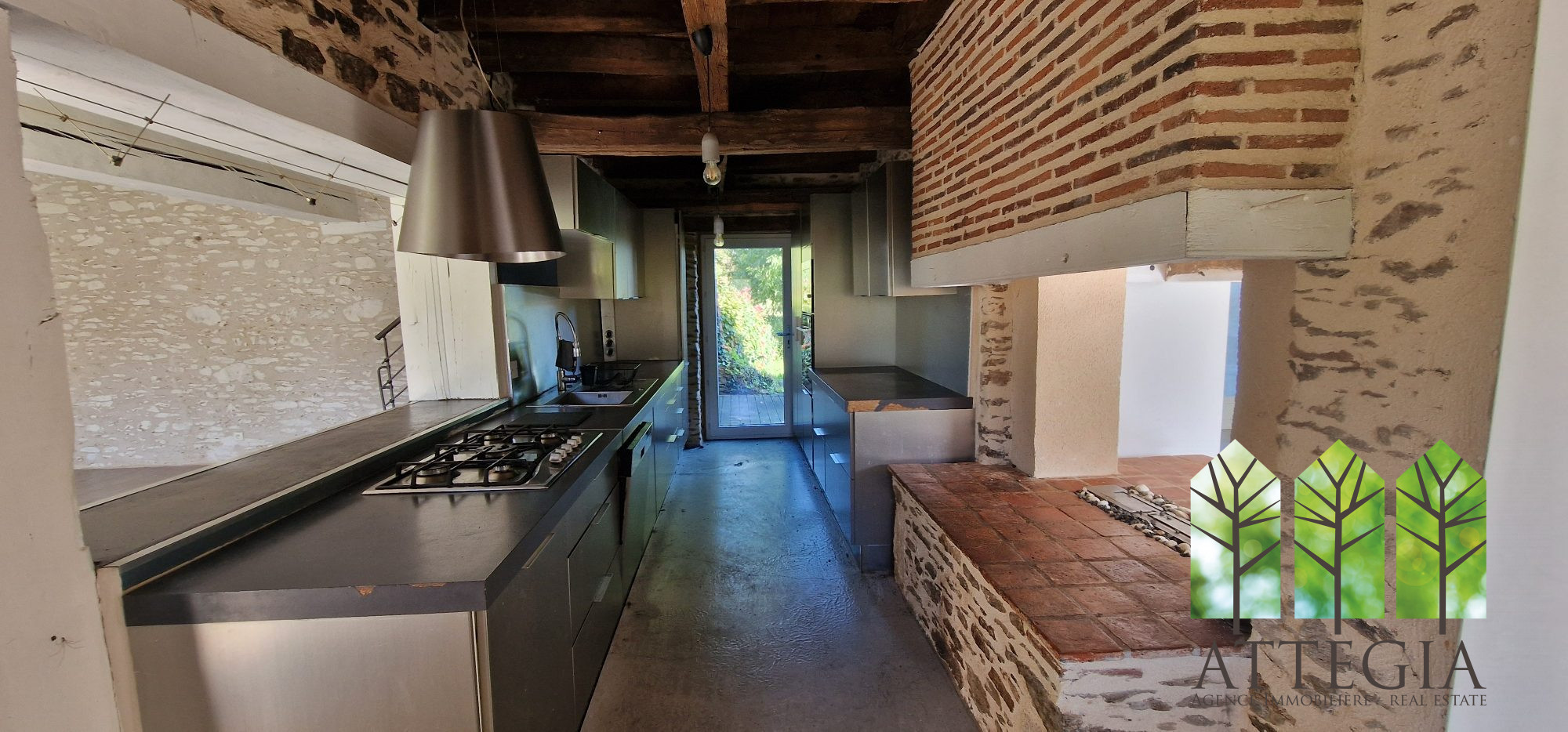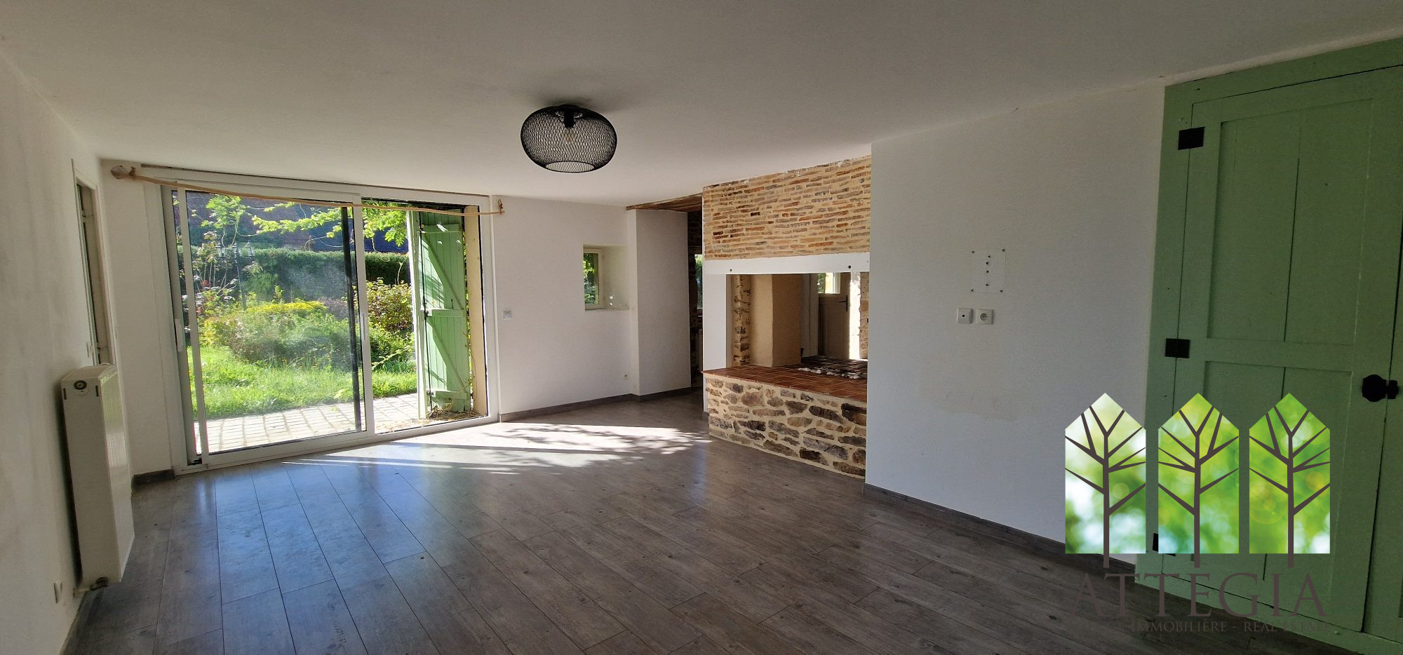 Un grand salon lumineux avec cheminée, ouvert sur une cuisine récente donnant accès à la terrasse arrière.