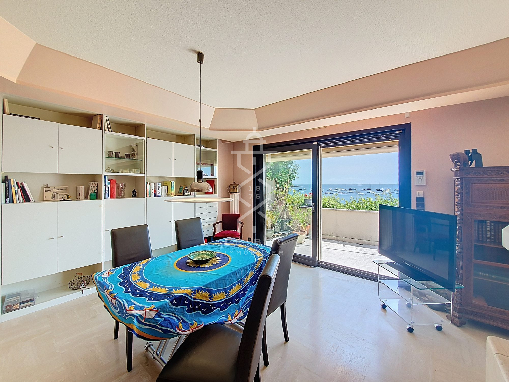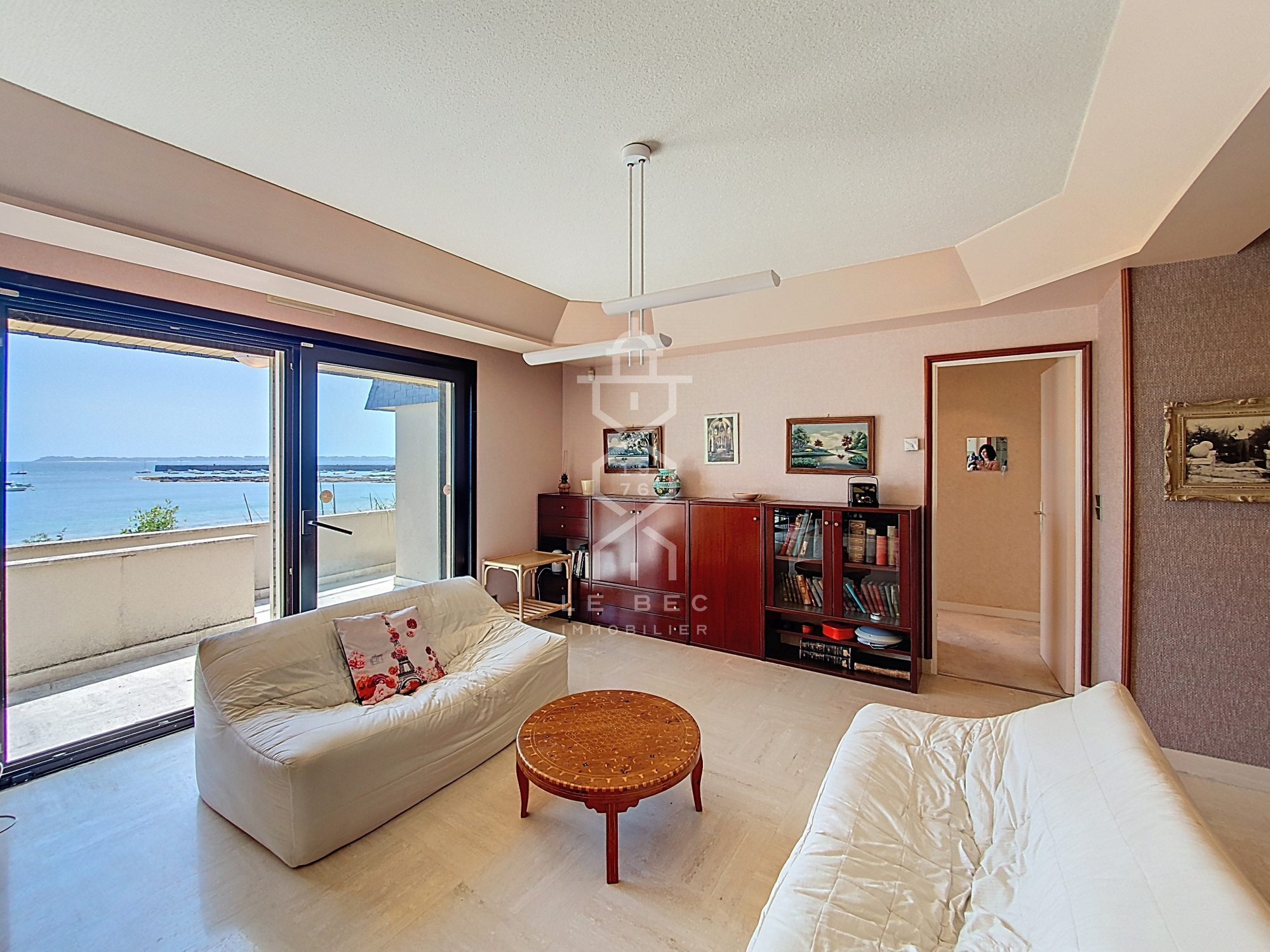 Une pièce de vie très confortable avec cheminée, baignée de lumière et ouverte sur une terrasse avec vue imprenable sur la mer !!