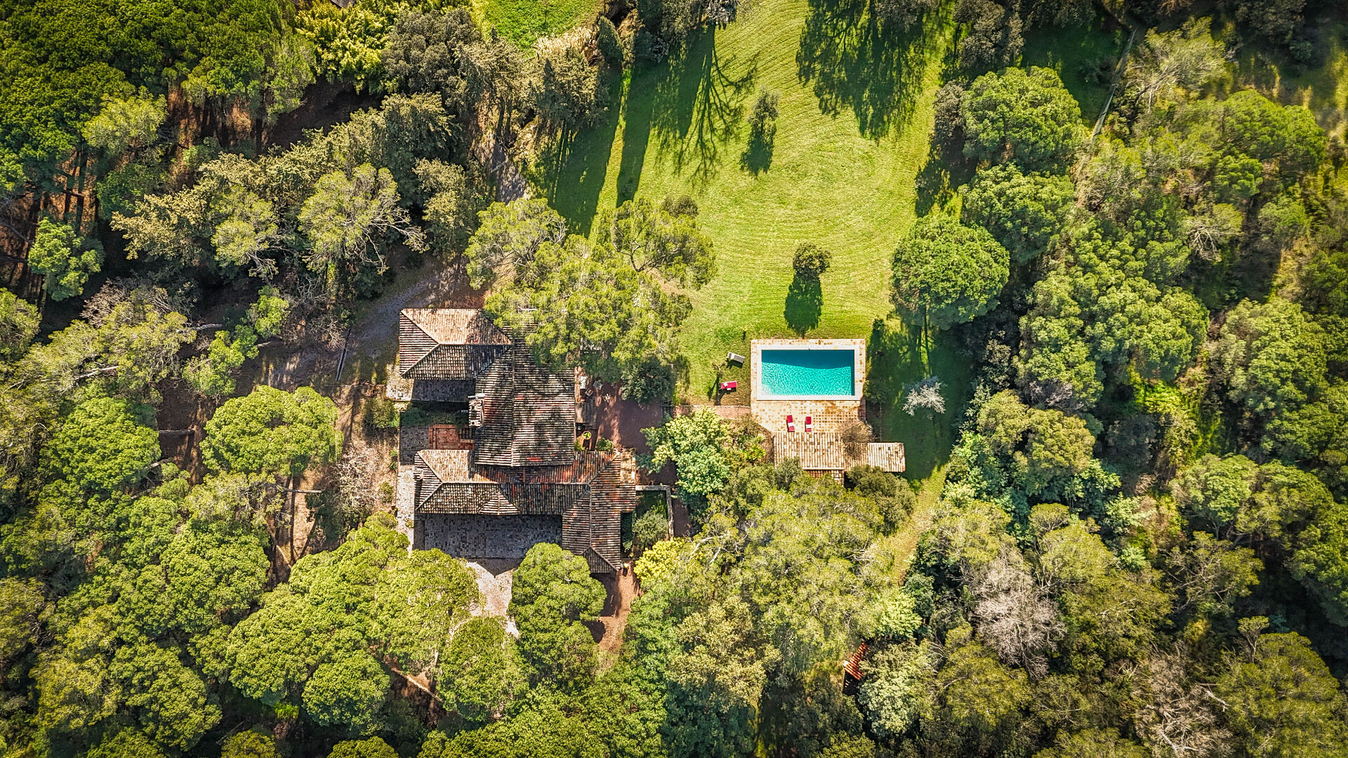 Le jardin paysager de plus de 10 000 m² accueille une grande piscine avec pool house, deux box pour chevaux, plusieurs forages assurant l'autonomie en eau, un garage fermé et une cave à vin.
