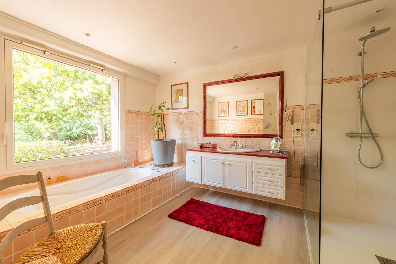 The property comprises 4 bedrooms, 3 bathrooms, 1 shower room, a separate studio, an office, a library, a dining room, a spacious kitchen, a pantry and plenty of storage space. The double living room with its majestic fireplace opens onto the park and outdoor areas.