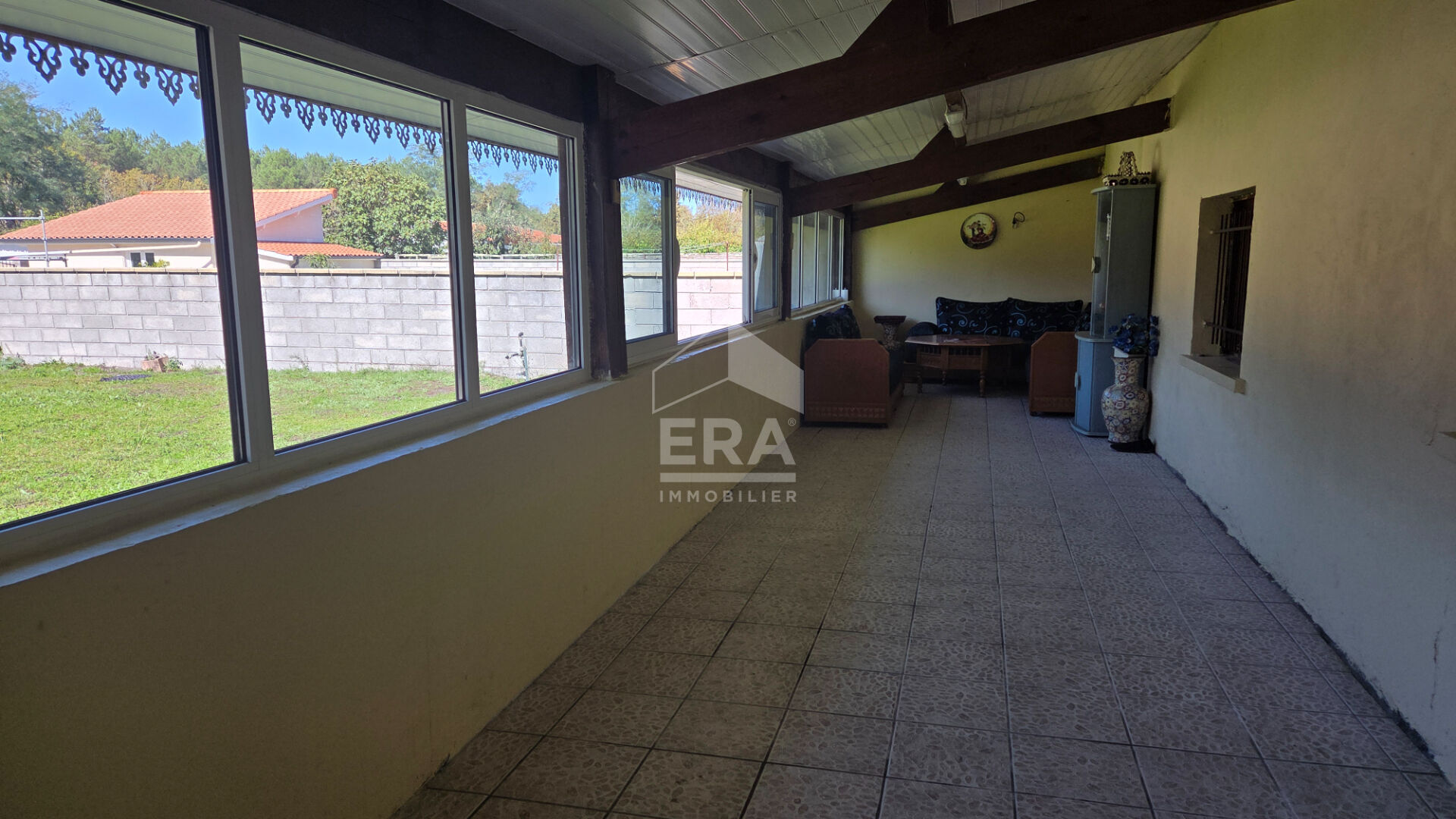 Une grande véranda d'environ 50 m², située à l'avant de la maison, apporte un espace de vie supplémentaire.
