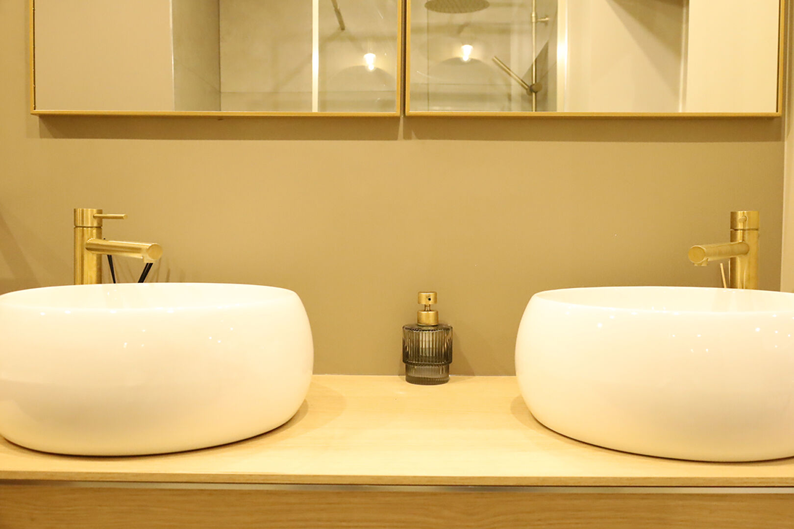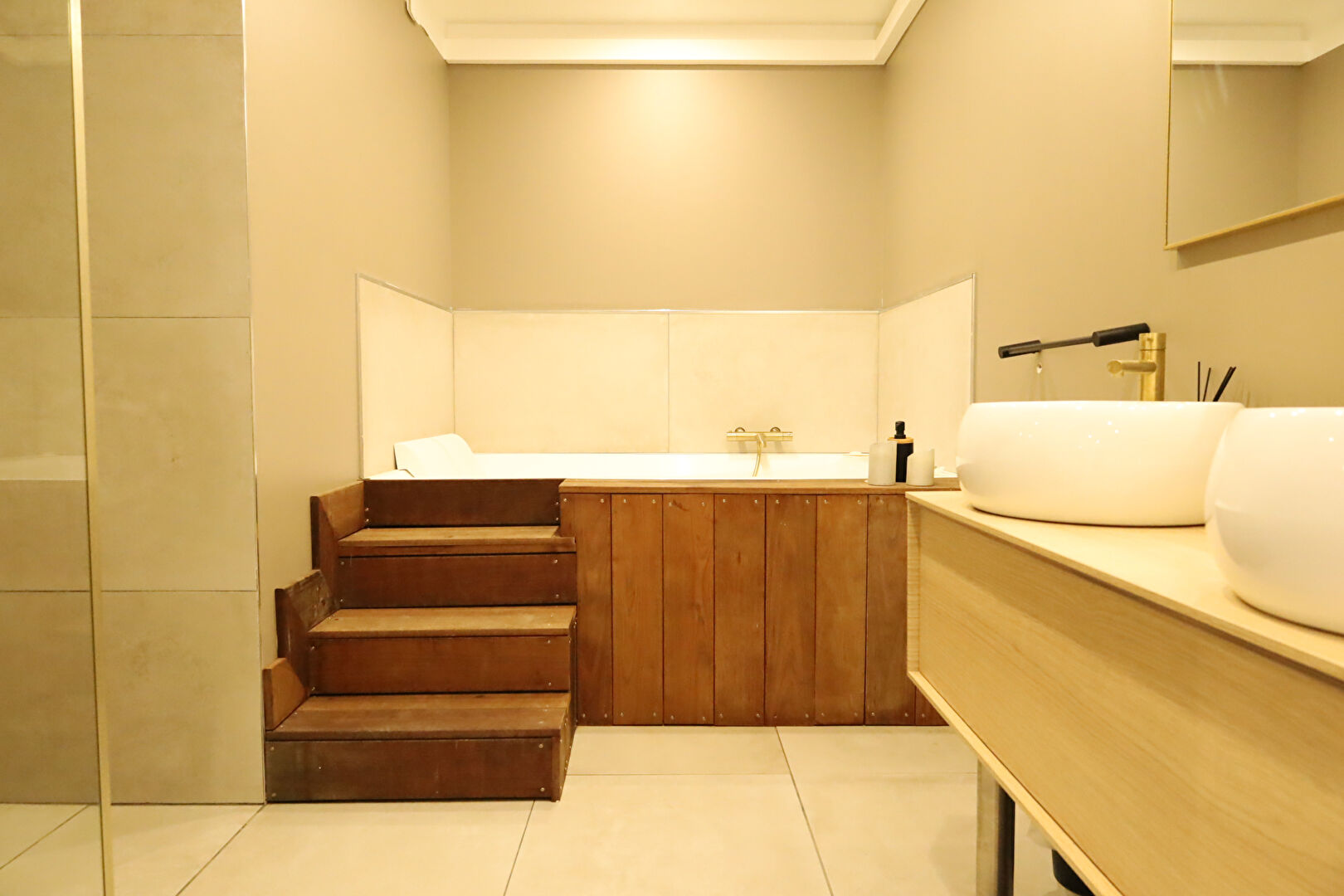 La salle de bain allie confort et raffinement : baignoire balnéo, double vasque et douche italienne.