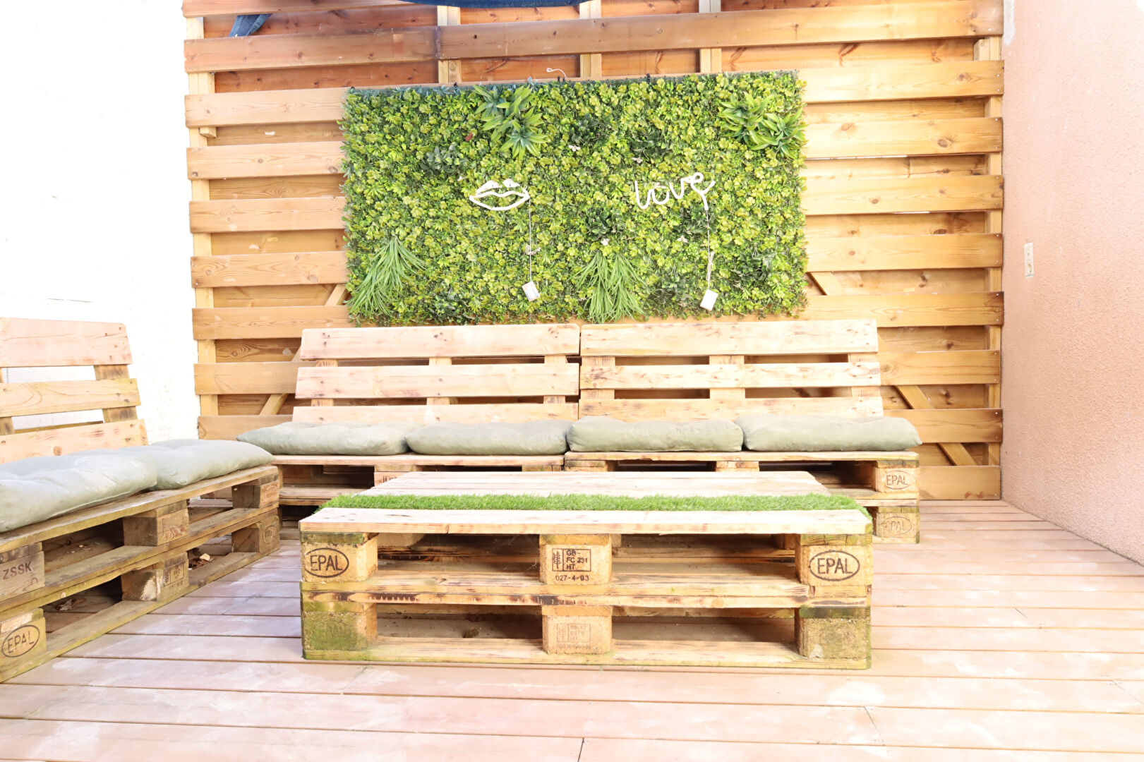 Pièce de vie élégante et lumineuse, composée d'un salon avec une cuisine équipée ouverte sur une terrasse intime, sans aucun vis-à-vis.
