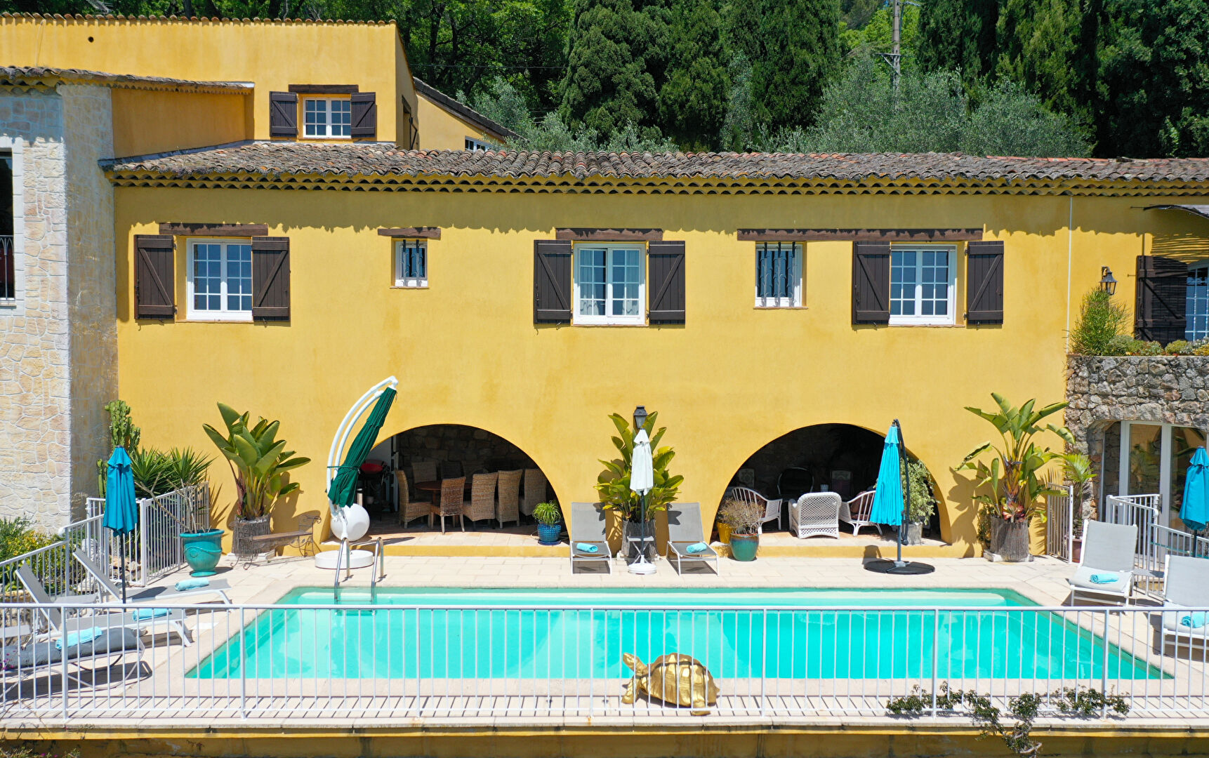 L'extérieur invite à la détente avec un superbe espace piscine de 10 x 4,5 mètres, entouré d'une grande terrasse et d'un pool house avec salle d'eau.