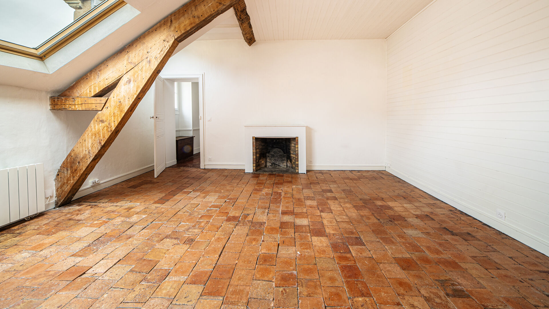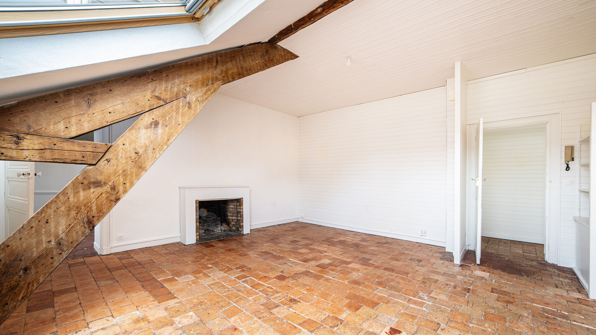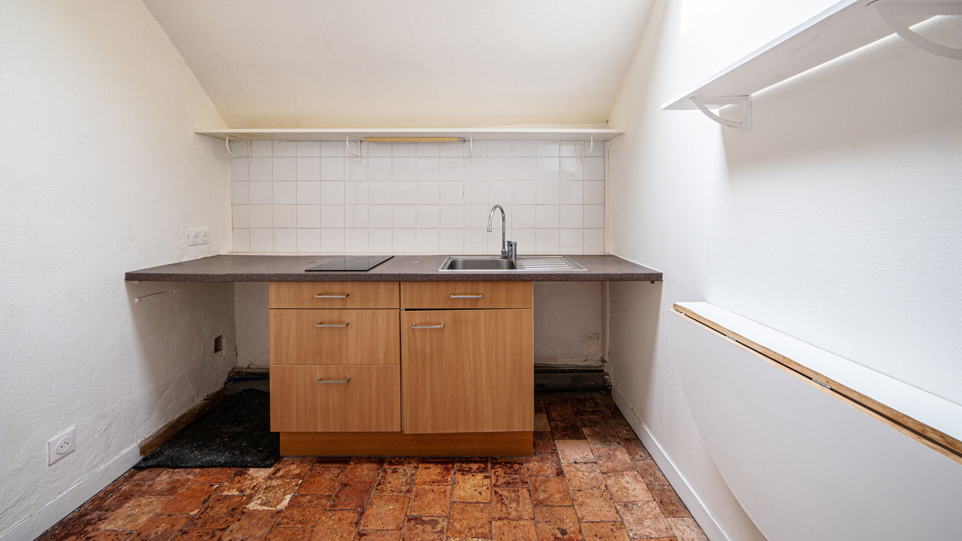 T2 bis en bon état, plein de charme et très ensoleillé, au calme offrant de beaux volumes : entrée, bureau, réception sur tomettes avec cheminée, cuisine, salle de bains, WC et chambre avec placard.