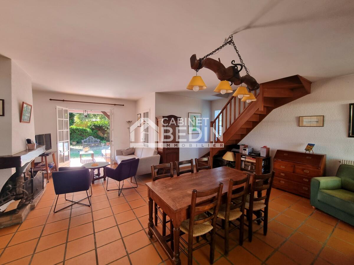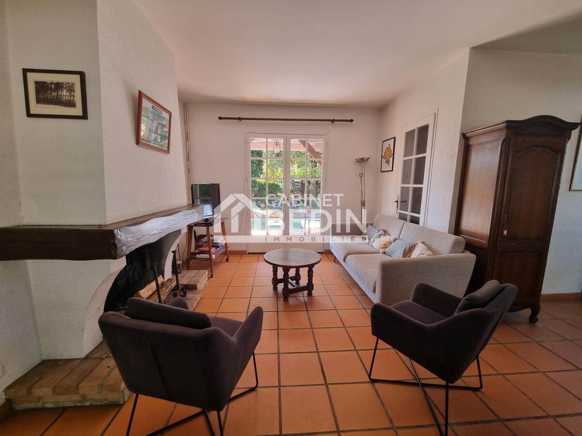 LE CANON CHARMANTE VILLA 5 CHAMBRES . Au CANON, charmante villa 138m² habitables avec étage, très bien entretenue, secteur calme et très recherché (proche des commerces et de la Plage du Bassin) jardin piscinable sud 796m². Jolie pièce de vie traversante avec cheminée, 1 cuisine équipée, 5 chambres, 1 bureau, 1 loggia, 2 salles d'eau, terrasse couverte pour repas.