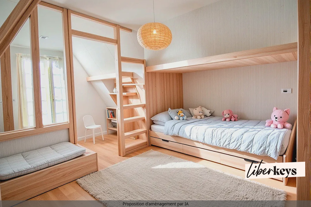 Le palier mène à trois chambres, dont une avec balcon et une autre climatisée + un bureau (plomberie existante pour création de sanitaires supplémentaires) et un grand débarras aménageable en dressing.