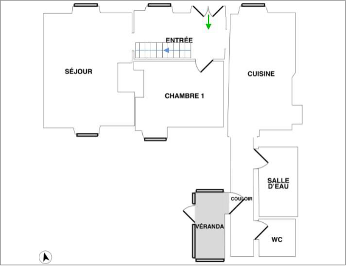 - Rez-de-chaussée comprenant une cuisine donnant sur un couloir avec accès à une salle d'eau et un WC, une chambre, et un salon salle à manger de taille moyenne.