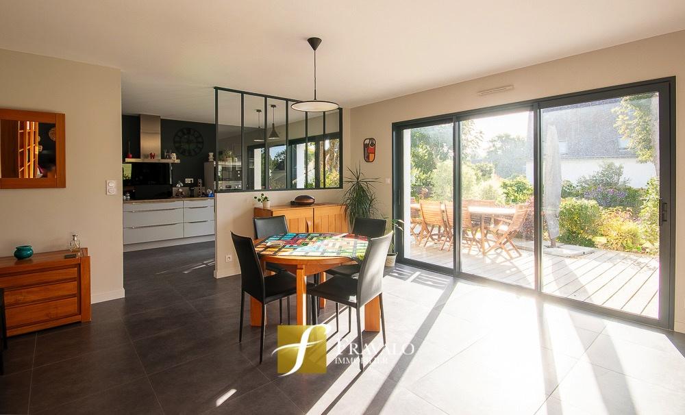 Emplacement recherché au calme d'une impasse pour cette maison contemporaine de 146 m2 aux prestations de qualité. Edifiée en 2018 dans le bourg de Baden, elle dispose au rez-de-chaussée d'une entrée avec rangements, d'un lumineux salon-séjour, d'une cuisine aménagée-équipée semi-ouverte, d'un cellier, d'une suite parentale avec salle d'eau et terrasse privative, une seconde chambre, un wc et un garage. A l'étage, le palier dessert trois belles chambres de 12 à 16 m2, une salle de bains, un wc et un grenier à aménager de plus de 20 m2. Un jardin paysager agrémente le bien implanté sur une parcelle de 680 m2. Estimation des coûts annuels d'énergie pour un usage standard du logement: entre 670 EUR et 940 EUR (abonnement compris). Les informations sur les risques auxquels ce bien est exposé sont disponibles sur le site Géorisques : georisques.gouv.fr