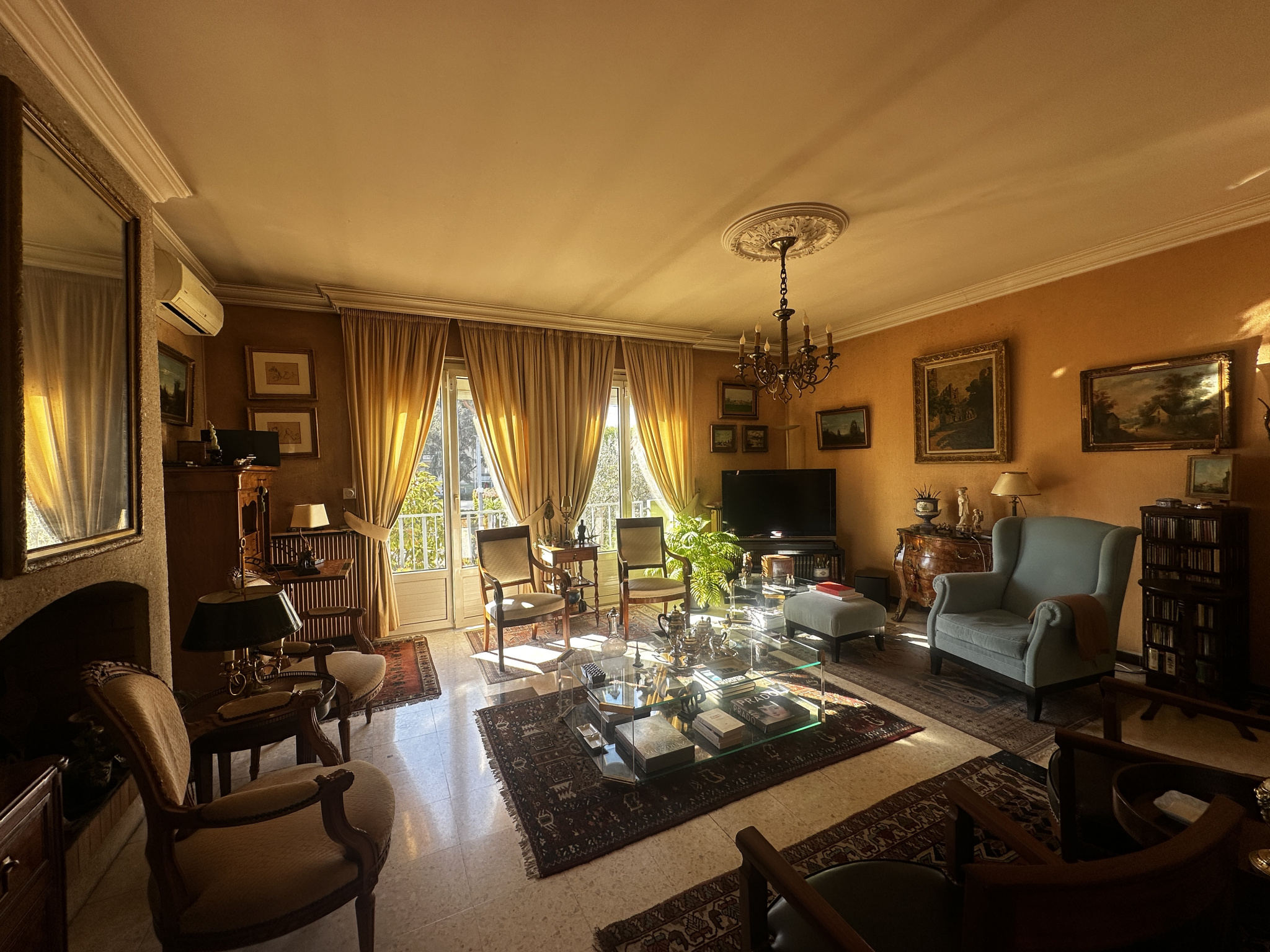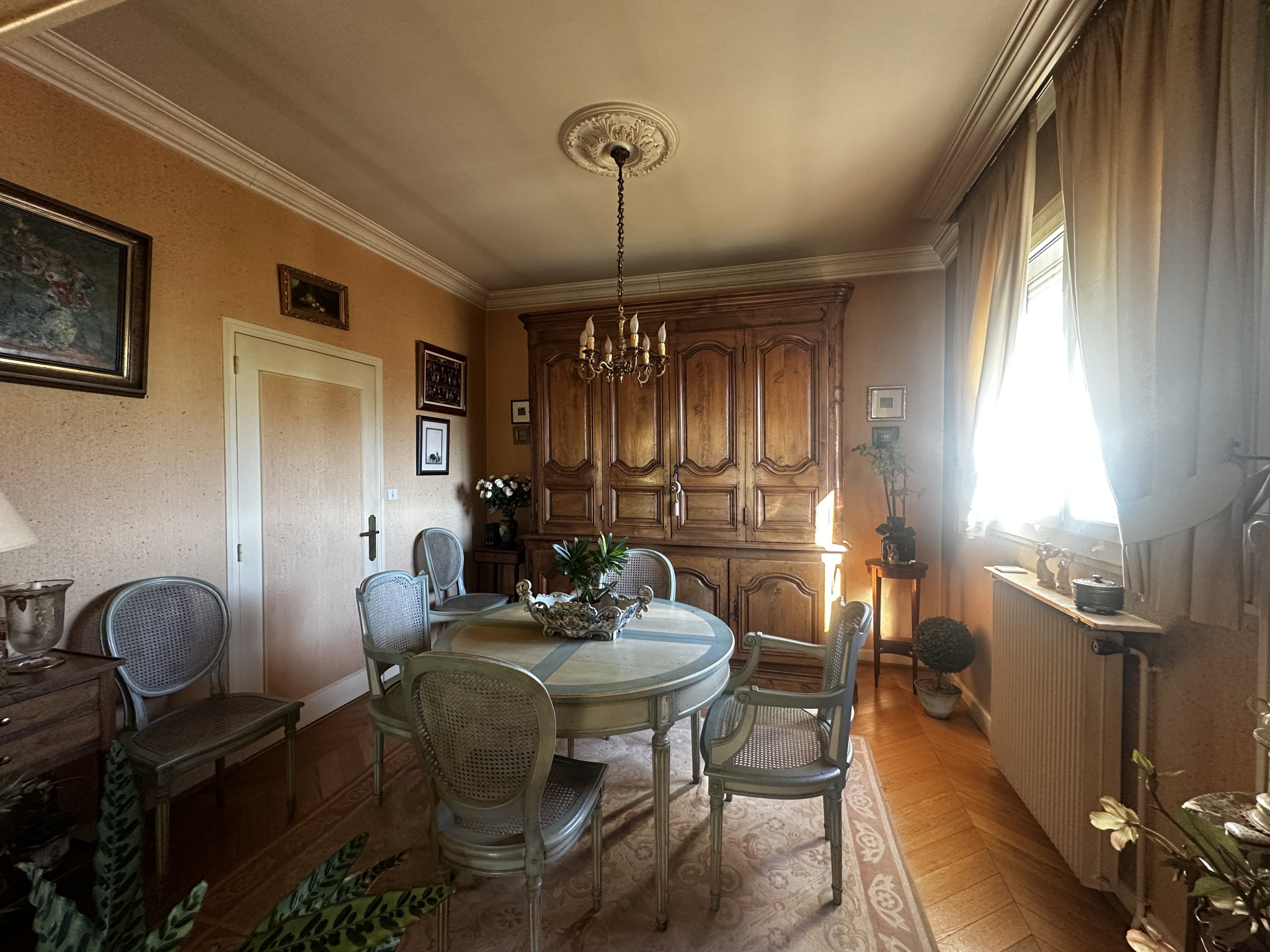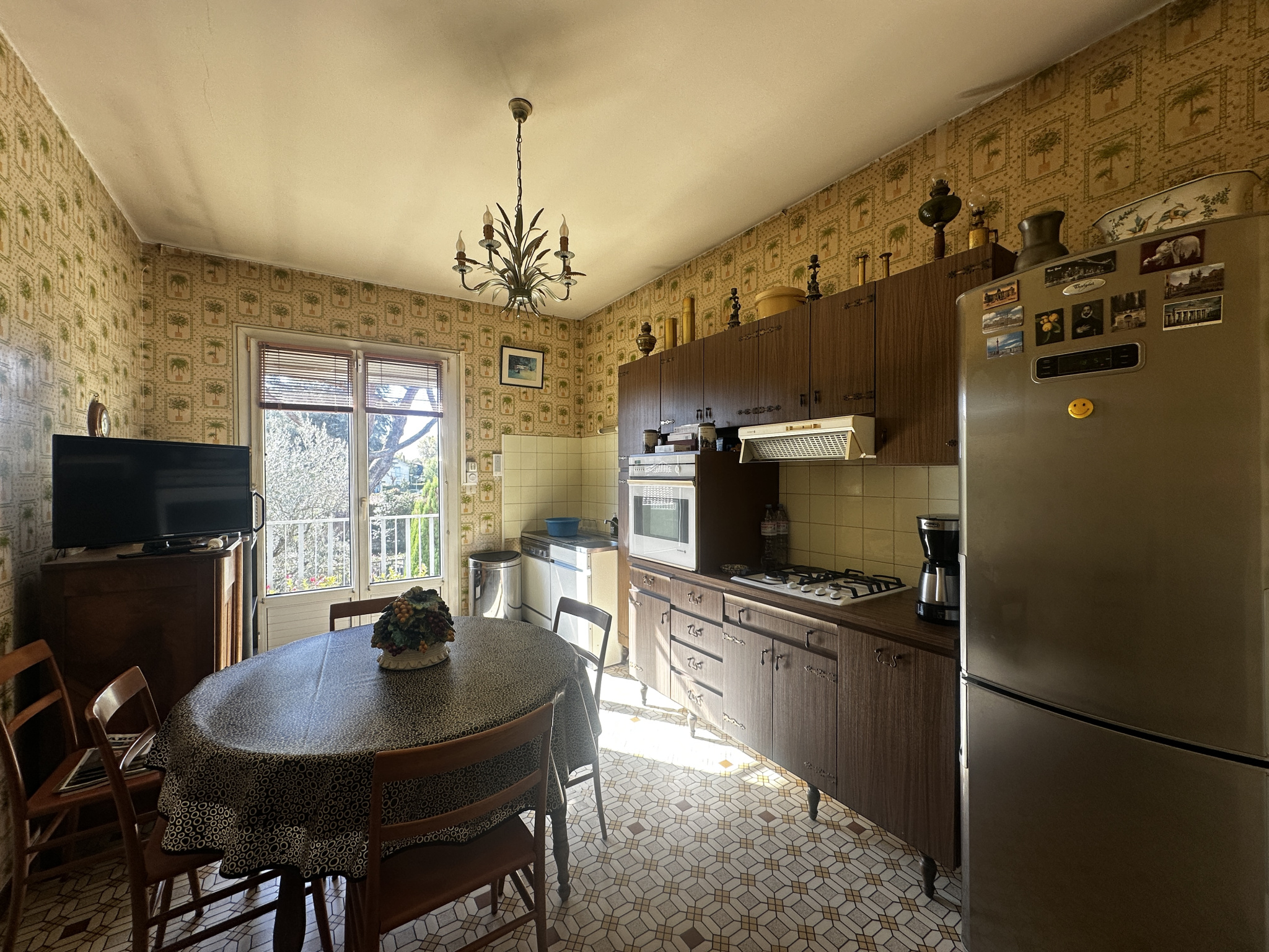 À l'étage, le palier dessert une cuisine indépendante (d'origine, à moderniser) et un séjour lumineux exposé plein sud, composé d'un salon avec cheminée et d'une salle à manger ouvrant sur un balcon filant équipé d'un store banne -- parfait pour profiter du soleil en toute saison.