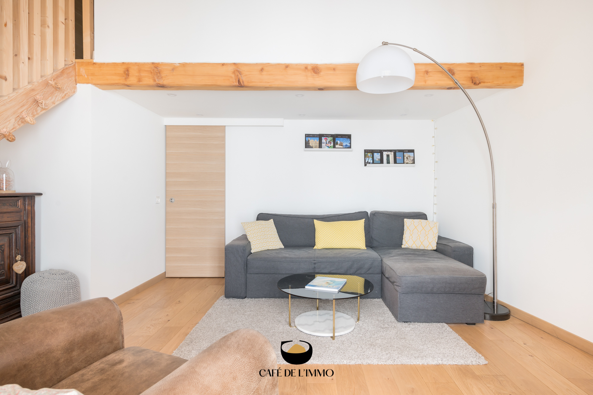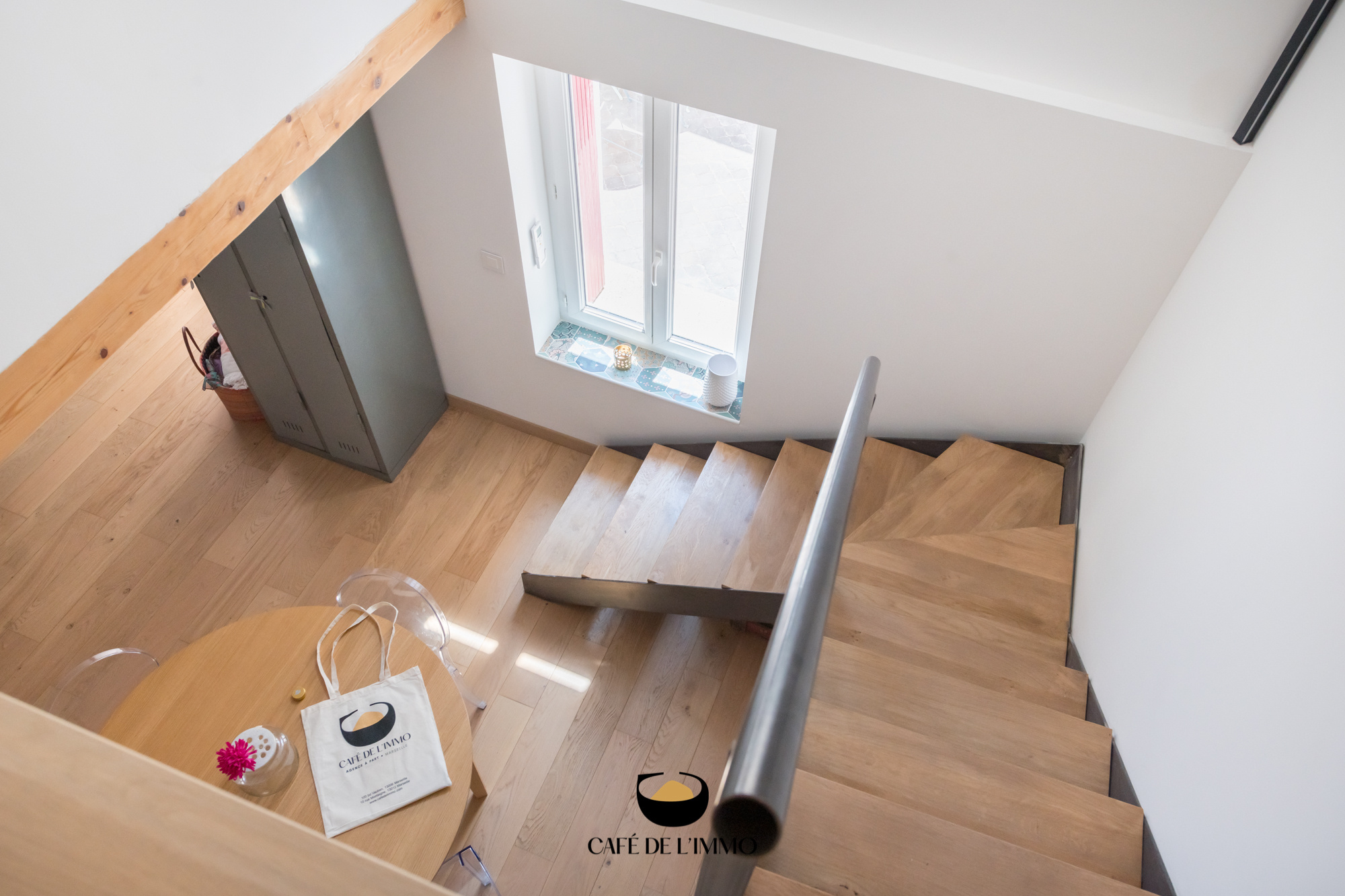 Dès l'entrée, la cuisine spacieuse et lumineuse donne le ton. Son exposition et sa belle hauteur sous plafond en font également une pièce de vie conviviale. Un élégant escalier en bois et fer forgé vous mène à la première chambre, qui bénéficie d'un accès à une petite terrasse, parfaite pour un bain de soleil.