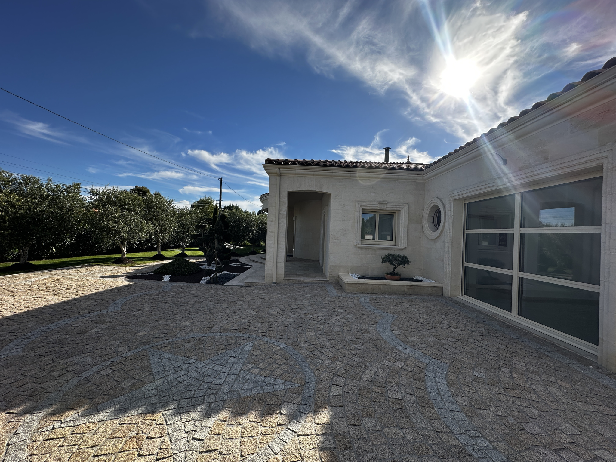 Les prestations extérieures sont à la hauteur : trois garages avec portails électriques, un grand parking pouvant accueillir un camping-car ou plusieurs véhicules, et un portail motorisé assurant confort et sécurité.