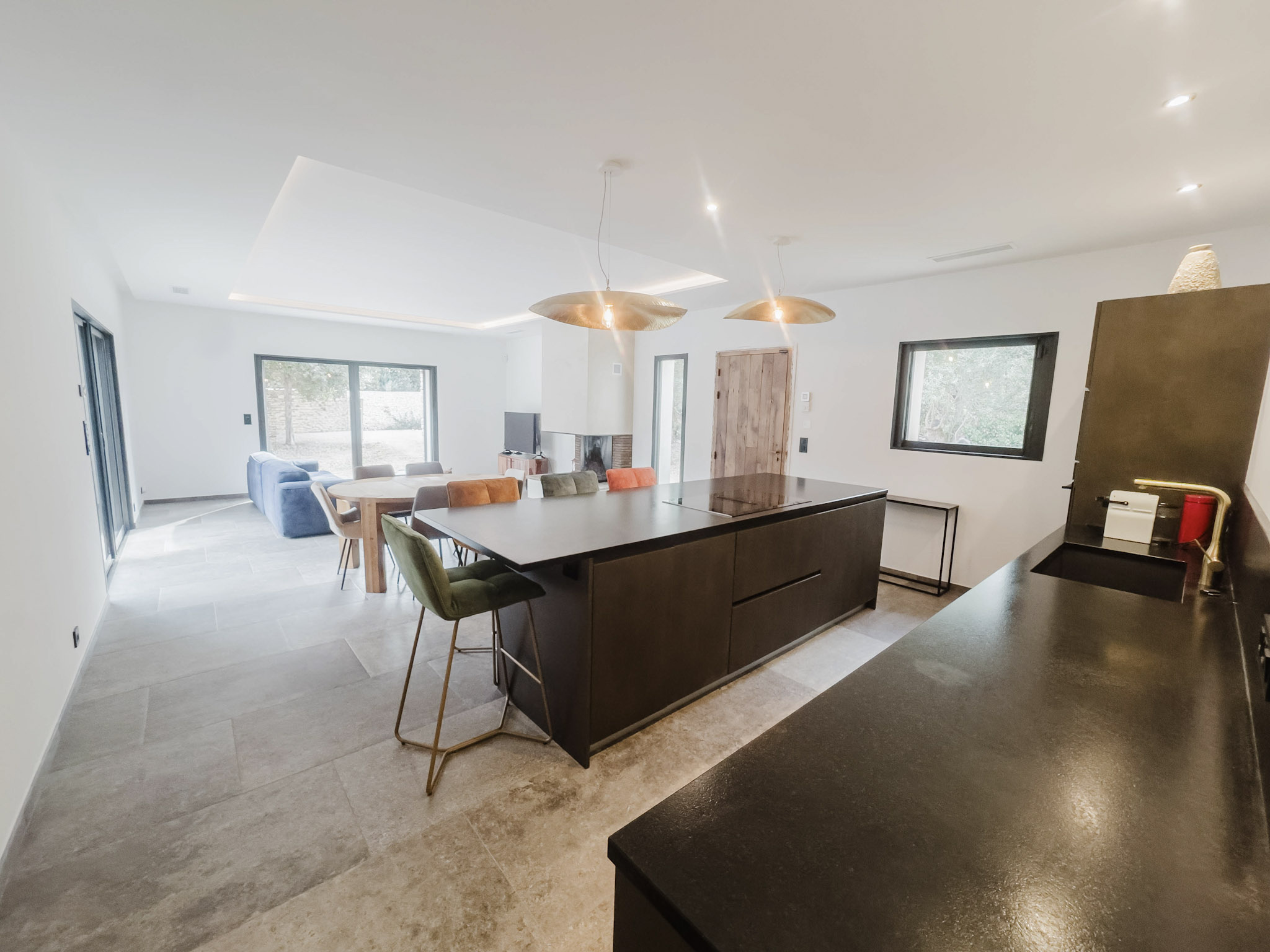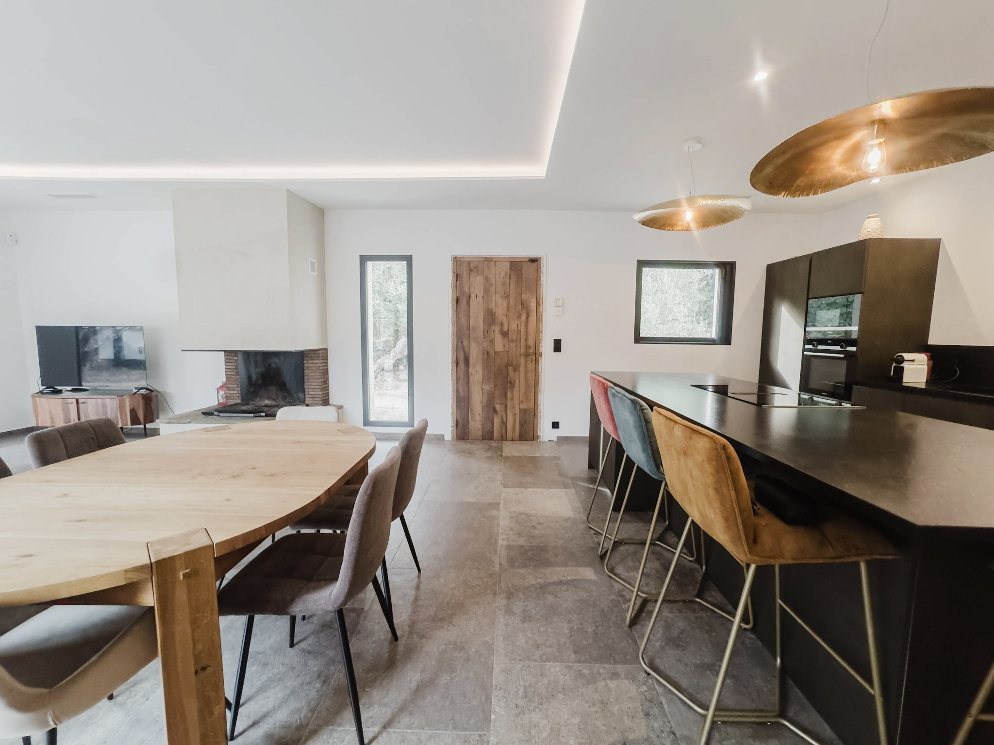 À cinq minutes des commodités et du port de Bonifacio, au coeur de la campagne bonifacienne, secteur Padurella, découvrez cette villa récente et lumineuse d'environ 130 m2 édifiée de plain-pied sur un terrain plat et entièrement clos de 1 276 m2. Elle propose un vaste espace de vie avec cuisine ouverte et cellier/buanderie, prolongé par de grandes baies vitrées à galandage et une cheminée à foyer ouvert, assurant confort et convivialité toute l'année. L'espace nuit dessert une suite parentale avec salle d'eau privative et dressing, deux chambres supplémentaires et une salle de bains. Toutes les pièces s'ouvrent sur l'extérieur, vers une superbe terrasse en ipé d'environ 70 m2 et une terrasse couverte d'environ 12 m2, exposées Sud, idéal pour profiter de la quiétude du maquis et des oliviers. De belle fabrique, réalisée avec des matériaux de qualité, cette villa offre un standing haut de gamme avec climatisation gainable, cuisine équipée avec plan de travail en pierre, volets roulants électriques, alarme et parement pierre qui signe le cachet de la maison, alliant tradition et modernité. Le terrain est arboré d'oliviers séculaires et est partiellement entouré de murs en pierre calcaire, offrant un cadre authentique dans un environnement calme et isolé, tout en restant proche de Bonifacio et des plages. Achevée en 2024 elle bénéficie de la garantie décennale.
