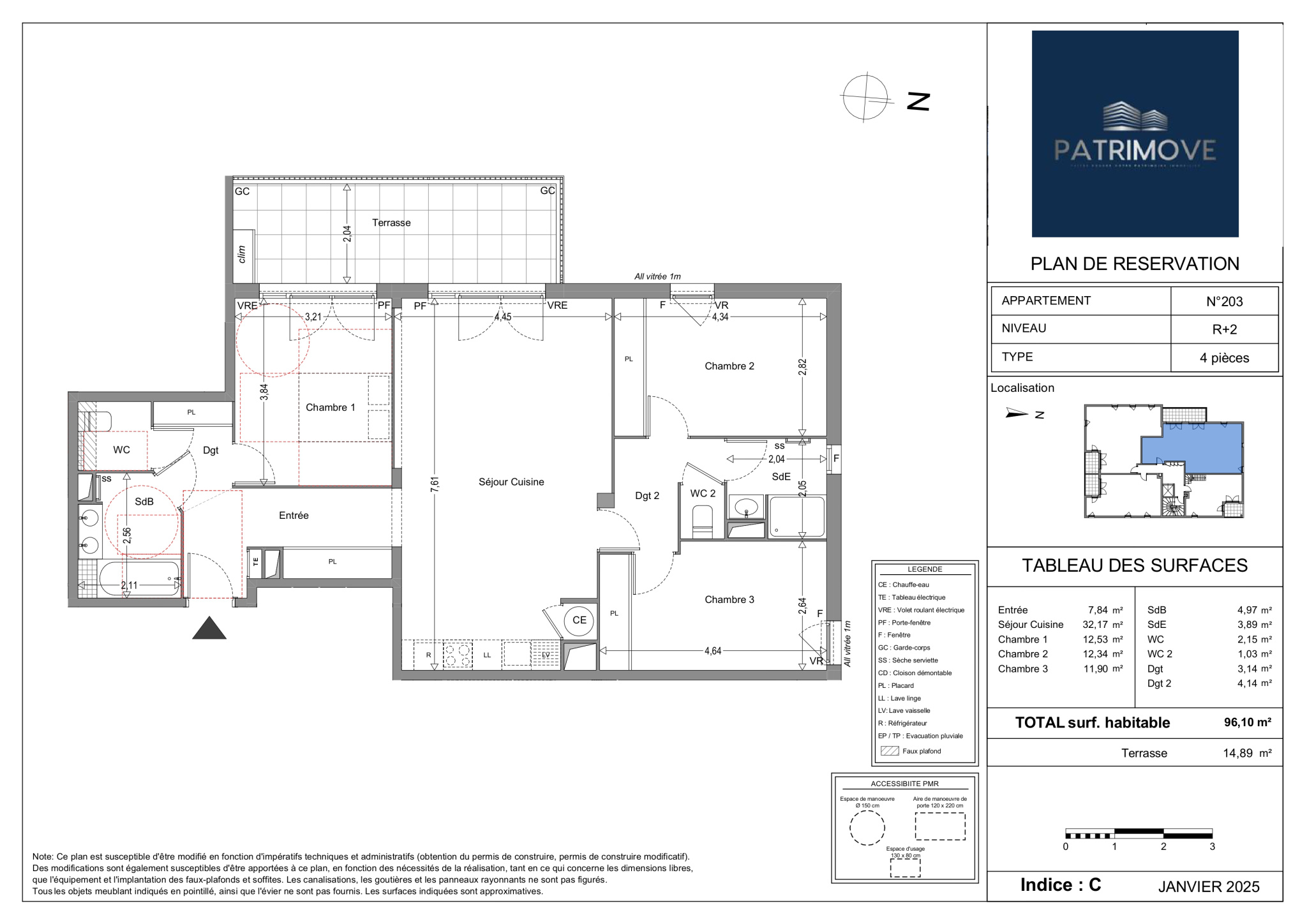 Grand appartement de 4 pièces de 96,10 m2 habitable, composé d'une pièce de vie séjour cuisine de 32,17 m2, de 3 chambres de 12,53 m2, 12,34 m2 et 11,90 m2, salle de bain et d'une salle d'eau avec deux WC séparé.