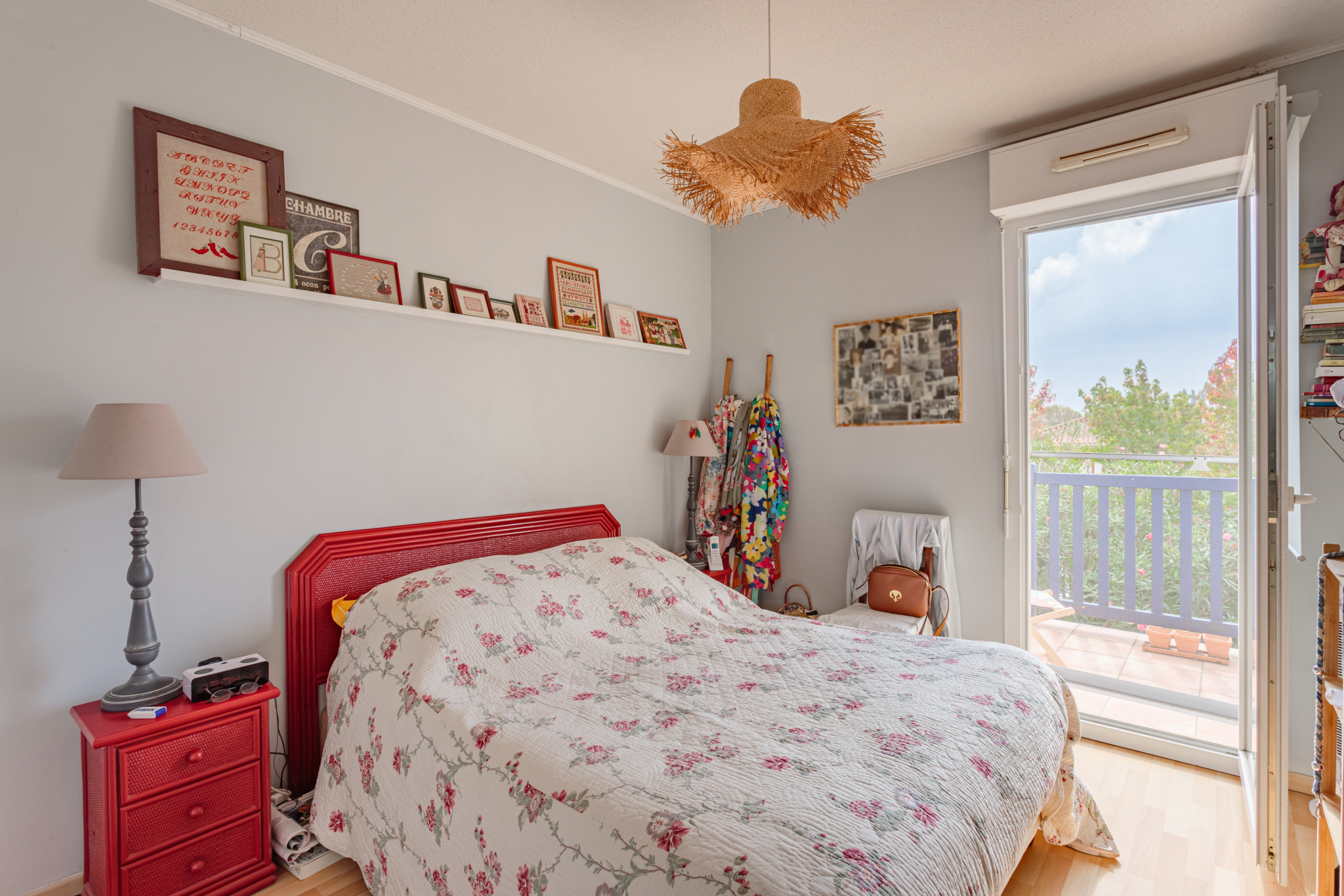 À l'étage, le palier est aménagé en coin bureau, desservant une salle de bain avec wc ainsi deux chambres avec placards intégrés et accès à une seconde terrasse.