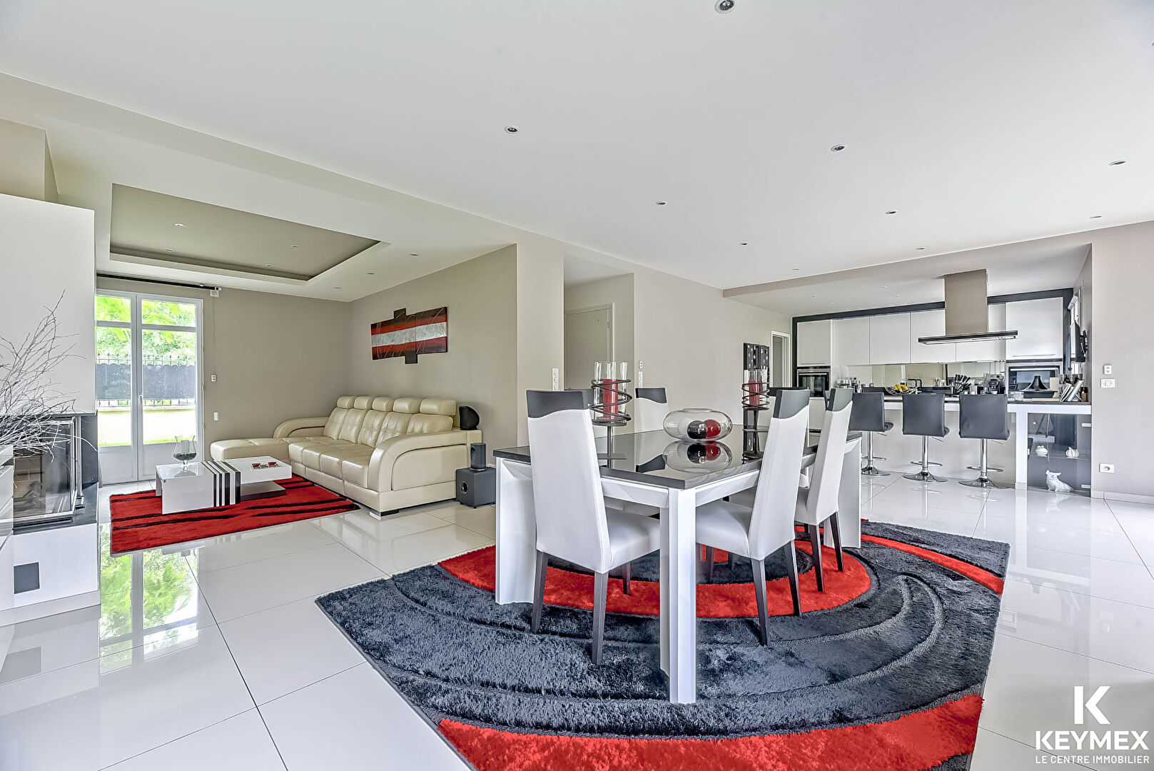 un vaste salon séjour de plus de 47m² avec cheminée , une cuisine tout équipée qui donne accès à un double garage .