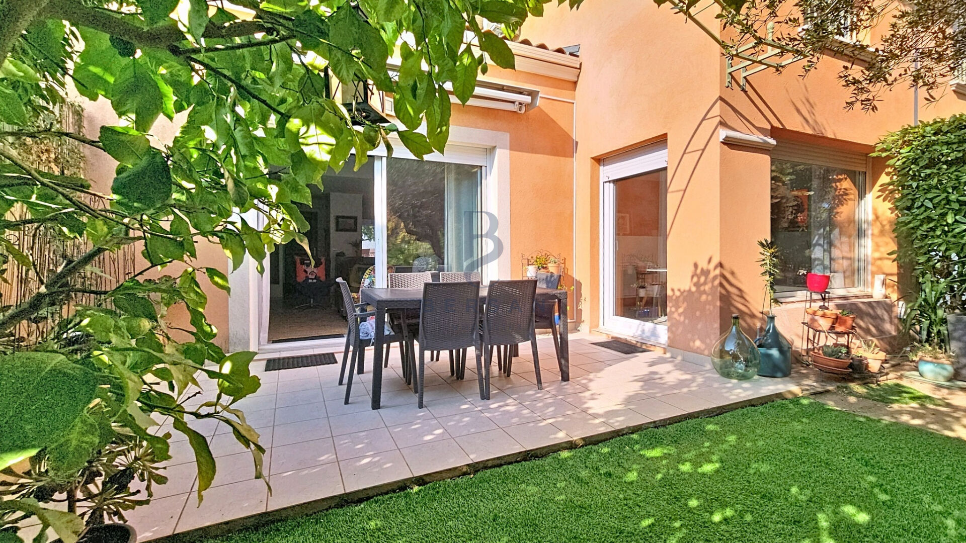 Le jardin privatif, clos et paysagé, forme un véritable cocon de verdure. Au fond, une coursive permet l'accès direct aux golfs. Un grand garage et une place de stationnement extérieure complètent le bien.