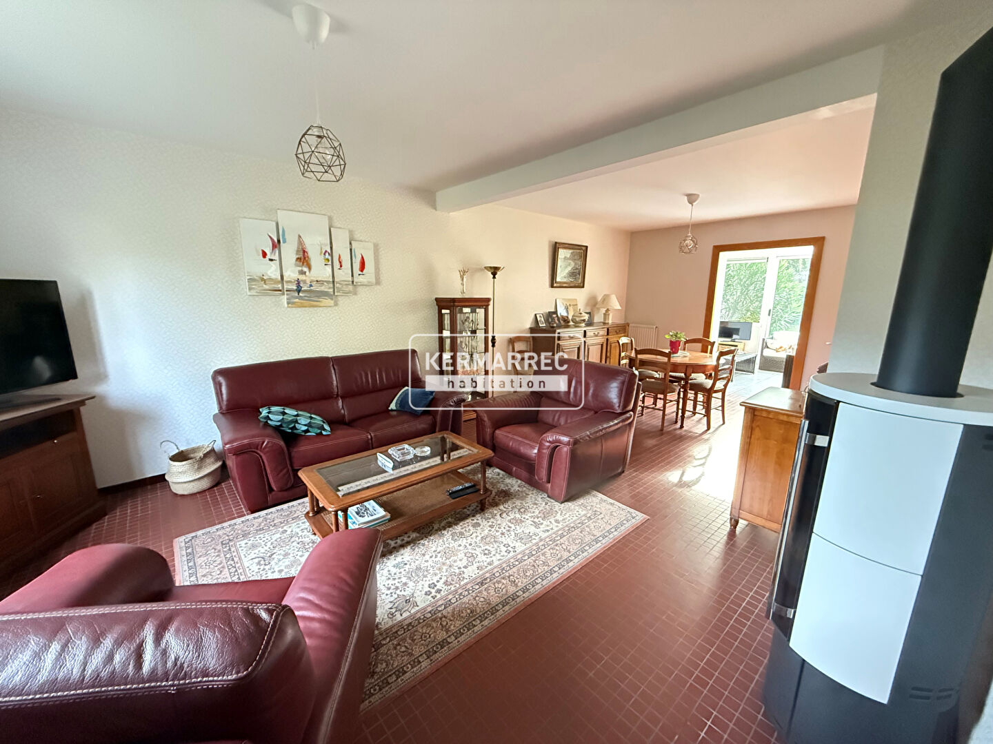 - Au rez-de-jardin : une entrée accueillante, un salon-séjour lumineux avec poêle donnant accès à la véranda, une cuisine aménagée et équipée (pouvant être partiellement ouverte sur le séjour), ainsi qu'un WC indépendant.