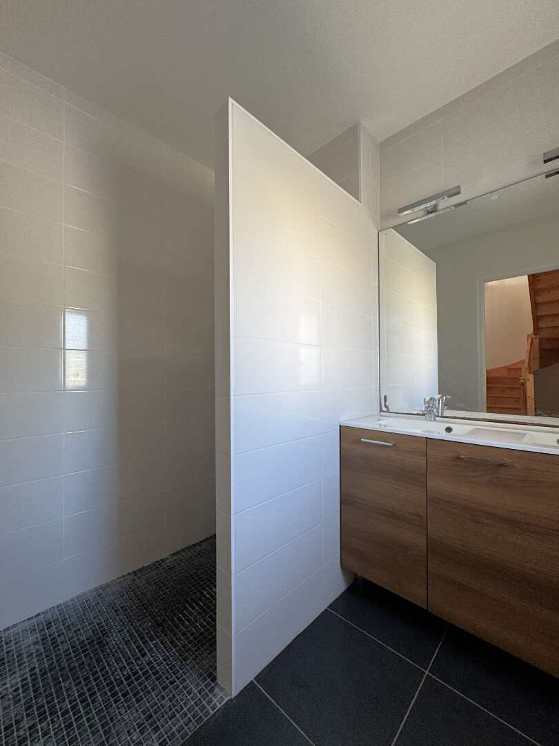 Au rez-de-chaussée, vous serez accueilli par une entrée avec placard menant à une belle pièce de vie baignée de lumière, orientée ouest, avec séjour et cuisine ouverts sur le jardin. Un cellier, un WC et un garage complètent ce niveau.