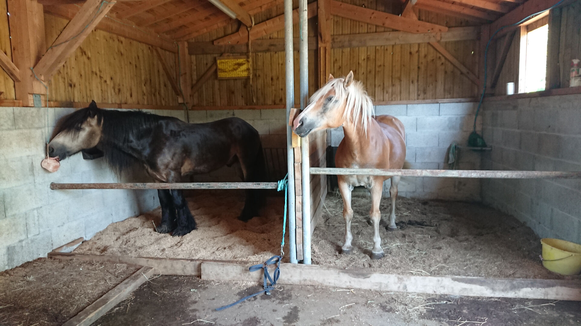 Vaste garage de 60 m² + galetas ; 3 box pour chevaux attenants à la maison + tunnel de stockage de 90 m².