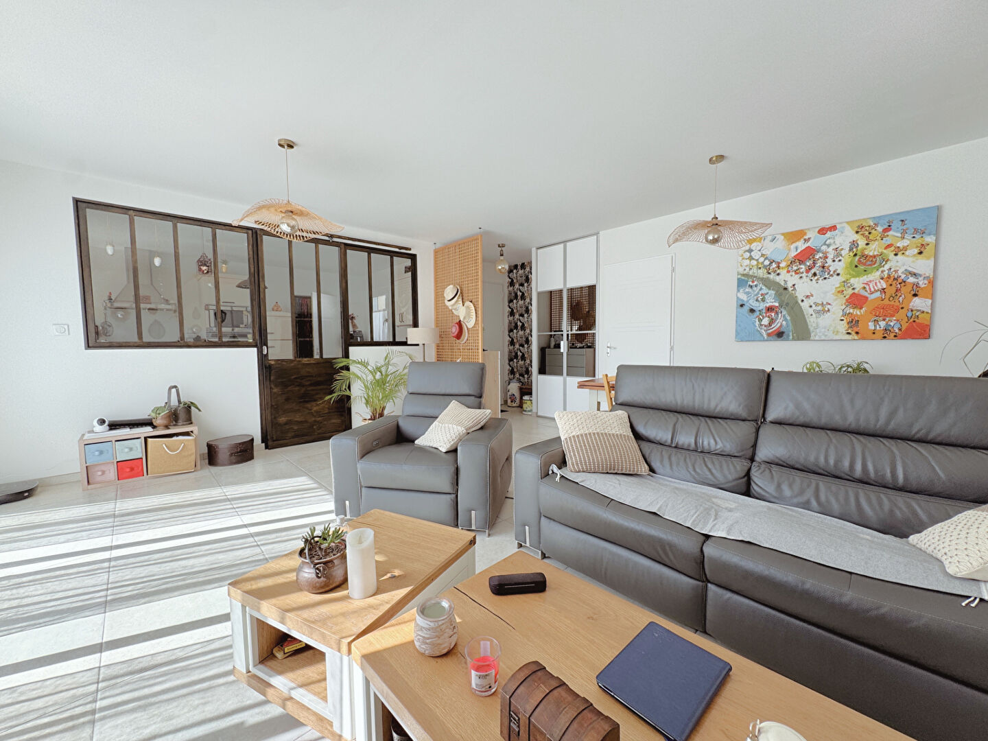 D'une surface de 95 m² habitables, elle se compose d'une entrée avec placard, d'un salon-séjour lumineux, d'une cuisine aménagée et équipée, séparée par une élégante baie atelier, ainsi que trois chambres, dont une avec dressing, une salle d'eau et un WC indépendant.