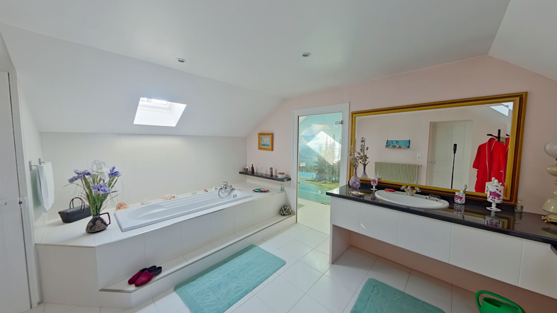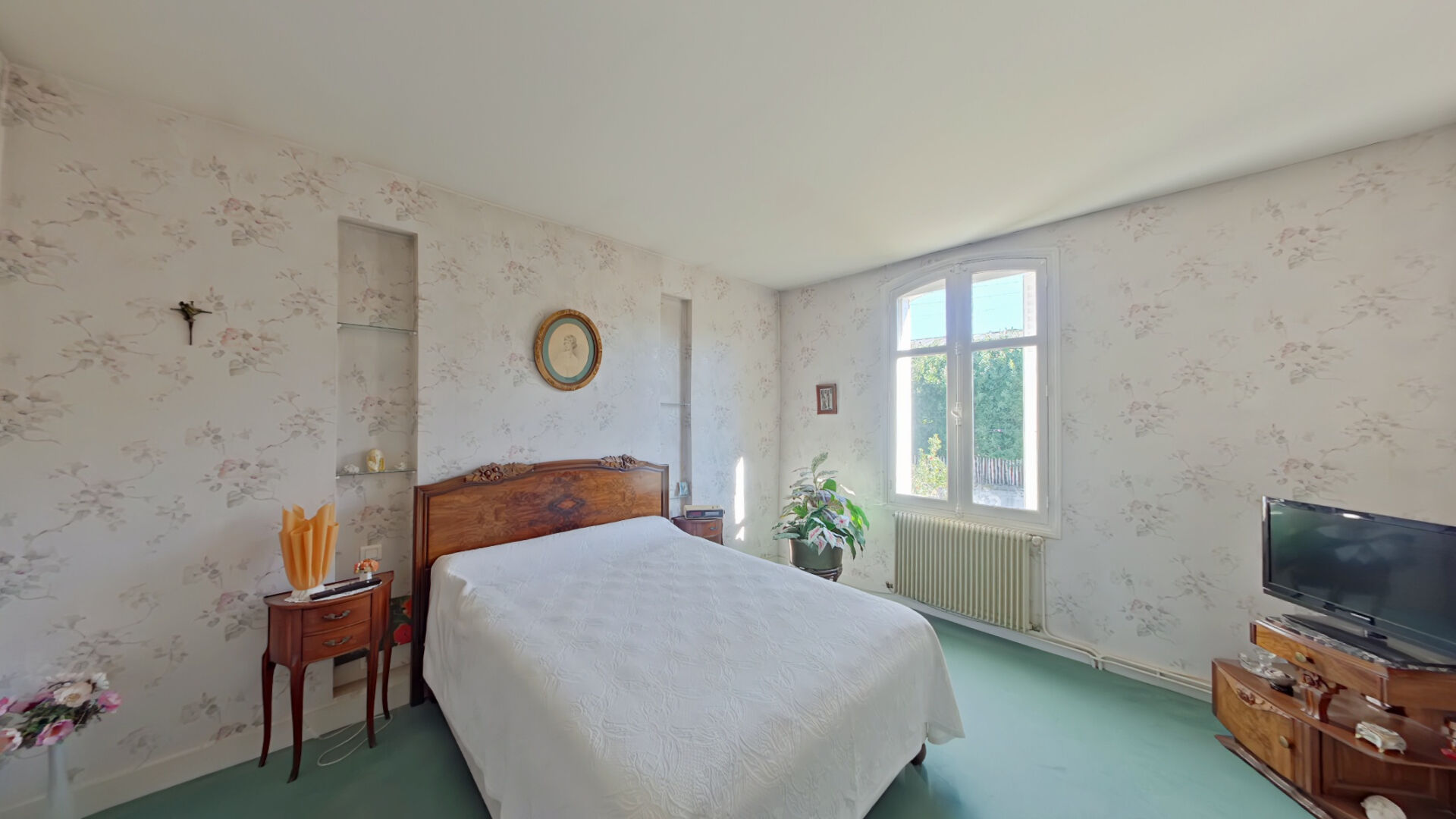 A l'étage, l'espace nuit se compose d'une chambre spacieuse avec une grande salle de bains attenantes, toilettes, dressing. Une seconde chambre avec point d'eau.