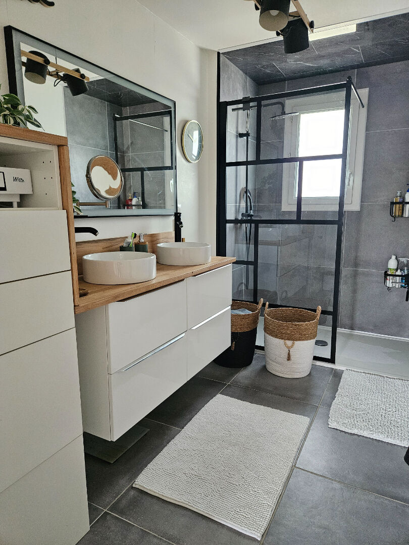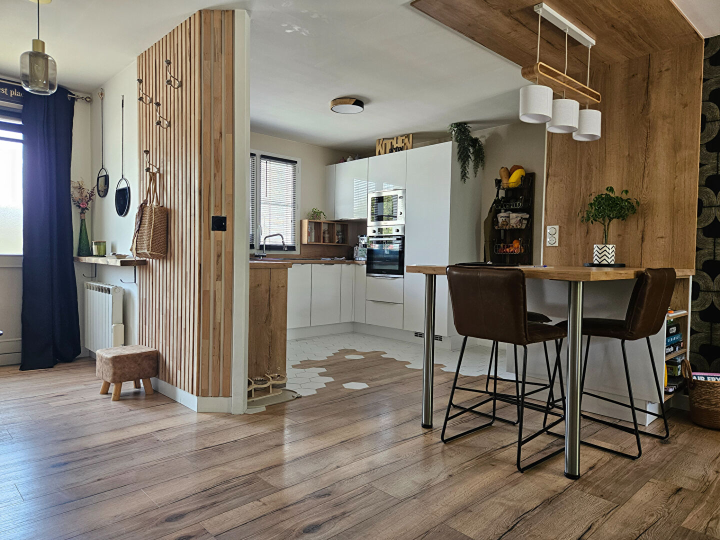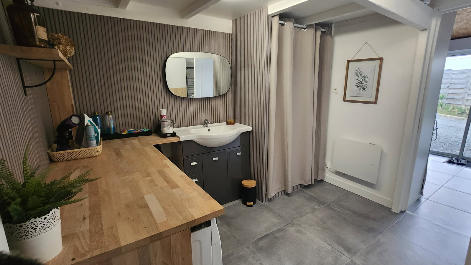 La cuisine, intégrée et entièrement équipée, s'ouvre sur un salon chaleureux, sublimé par un poêle à bois, parfait pour des soirées cocooning. Une arrière-cuisine ainsi qu'une buanderie avec accès direct à l'extérieur viennent compléter cet espace de vie pensé pour le confort et la praticité.
