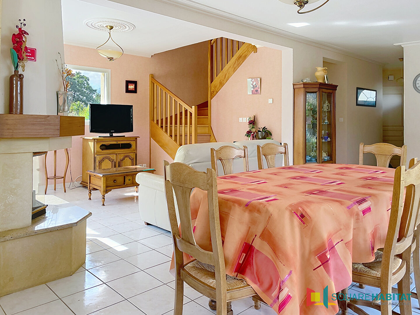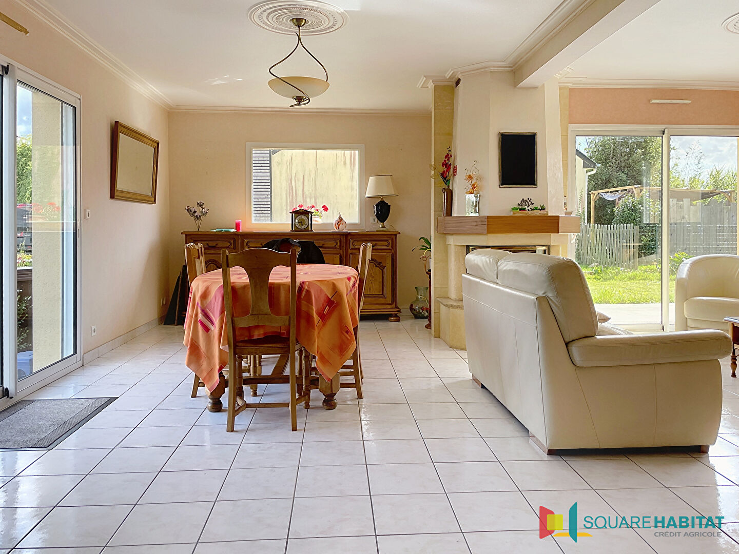 Elle offre une belle pièce de vie lumineuse avec une cheminé insert, cuisine aménagée et équipée, ouvrant terrasse et sur un grand jardin, idéal pour profiter du calme et des beaux jours.