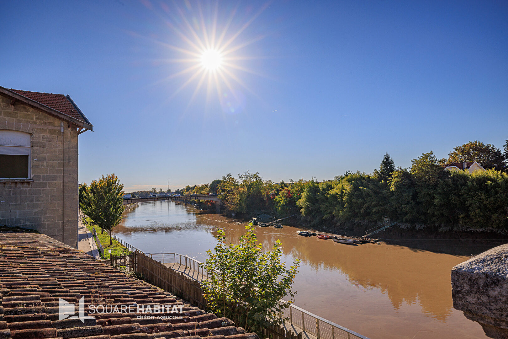 Dissimulée derrière son parc, superbe demeure essentiellement de plain-pied, avec immenses caves chargées d'histoire, et grande terrasse, le tout proche du centre ville et donnant sur la rivière, à proximité de l'ancien lavoir. (mais pas située en zone inondable).