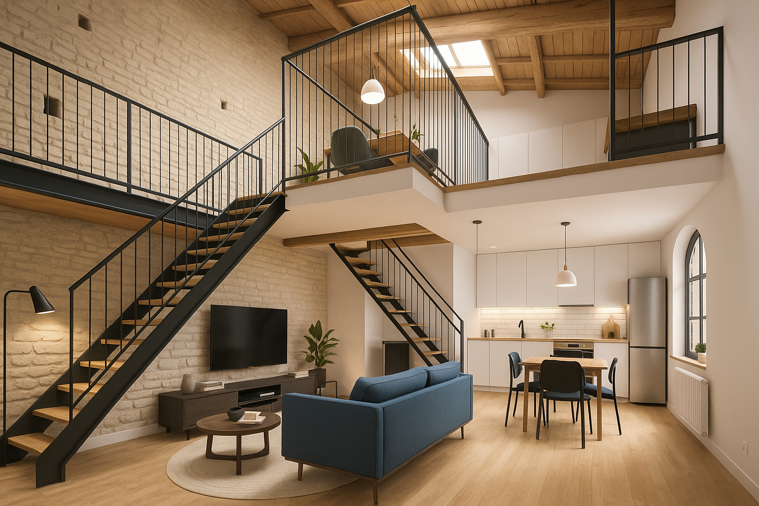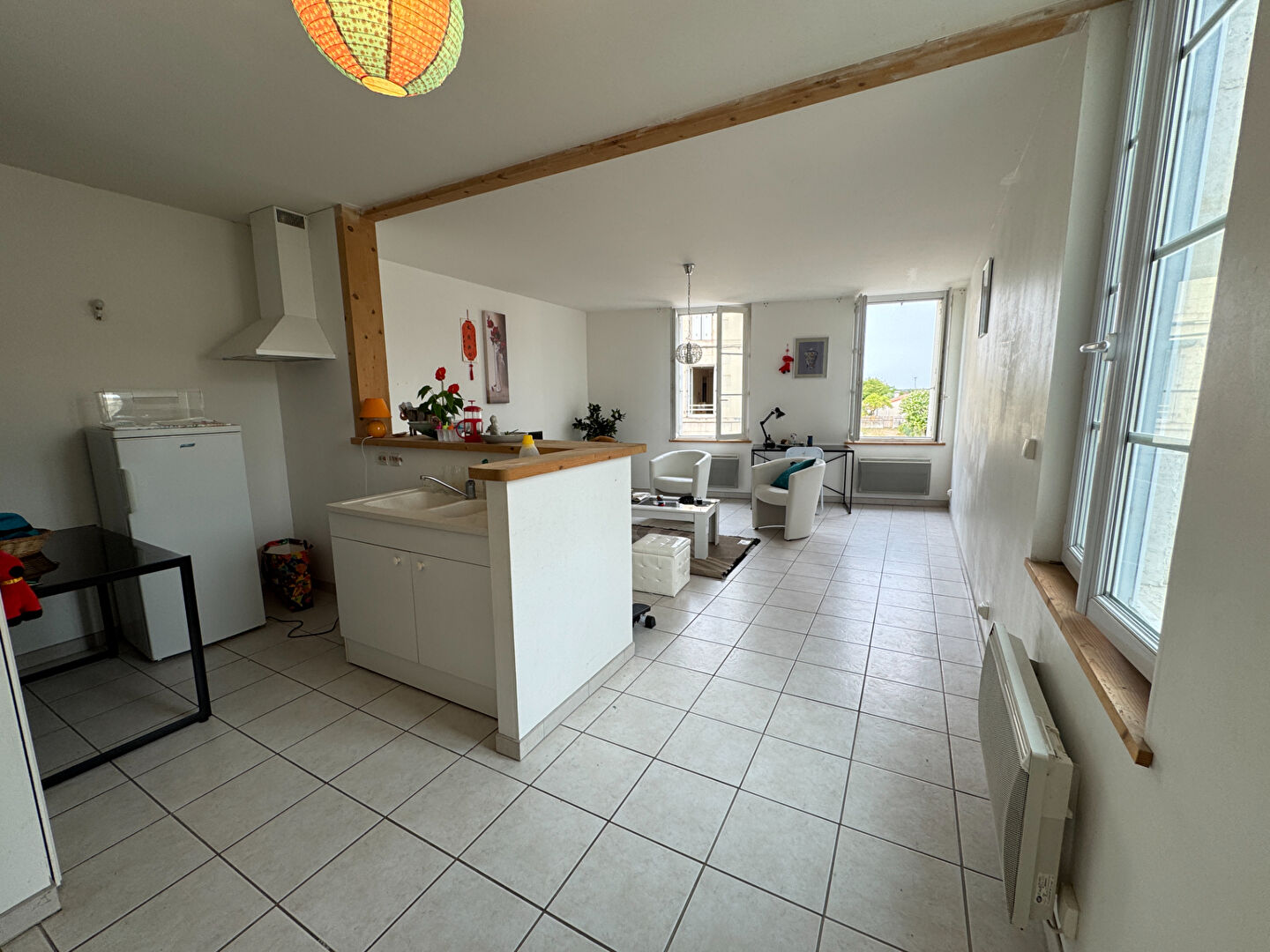 Appartement - duplex  (premier étage) : cuisine ouverte sur un salon, dégagement desservant 2 chambres, WC avec salle d'eau .