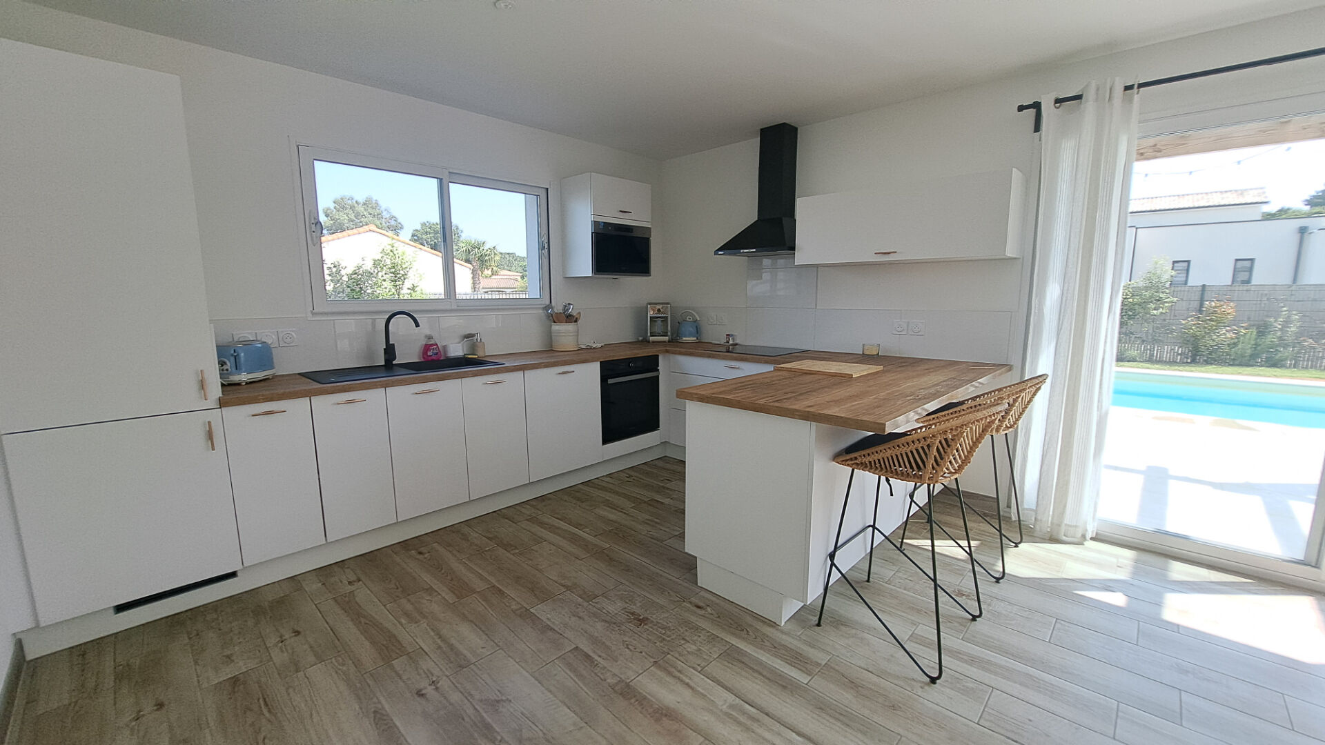 Au rez-de-chaussée, la maison offre une entrée sécurisée, un vaste séjour de 55 m2 avec cuisine ouverte lumineuse grâce à de grandes baies vitrées qui s'ouvrent sur la terrasse avec piscine. La cuisine aménagée et équipée, avec ilot central complète élégamment l'espace salle à manger. Vous disposez également d'une suite parentale avec salle d'eau/wc et dressing, ainsi qu'un cellier/buanderie avec wc pour de nombreux rangements.