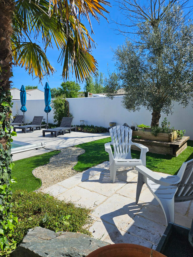 Profitez d'une belle grande terrasse exposée SUD/OUEST avec sa piscine en liner armé (très peu d'entretien) entourée d'un jardin zen, arboré et parfaitement clos.