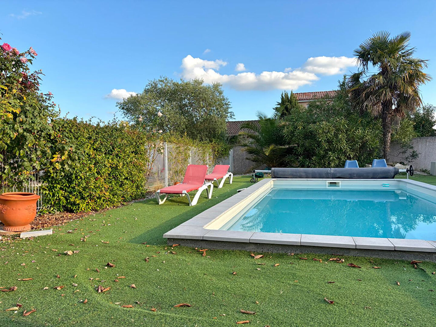 Une piscine entièrement clôturée, avec un abri pour stockage. Un puits.