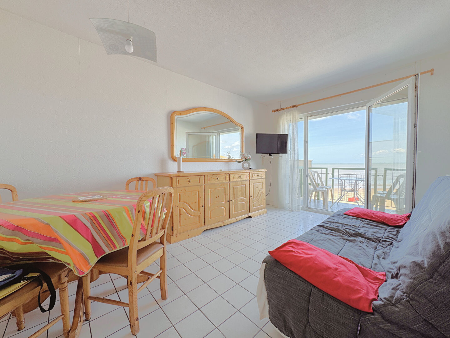 - Une pièce de vie lumineuse avec kitchenette ouverte sur un balcon vue mer,
