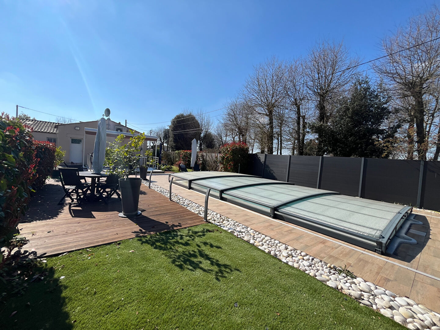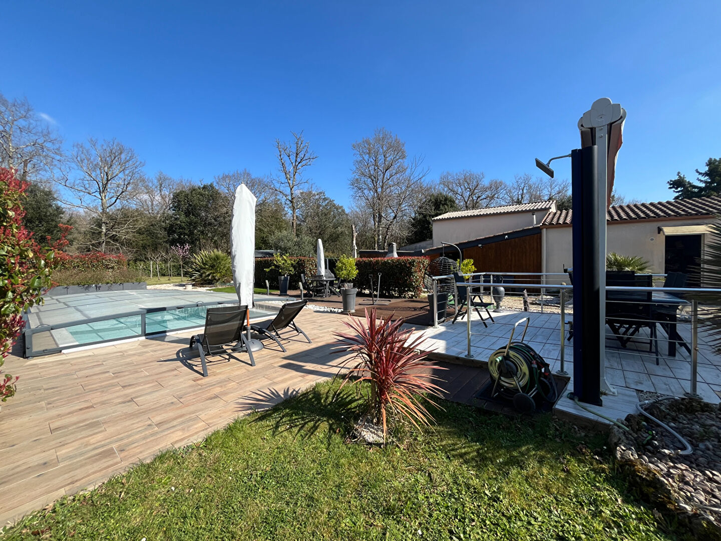 Côté extérieur, vous profiterez d'un jardin arboré soigneusement entretenu, d'une piscine couverte ainsi que d'une dépendance.