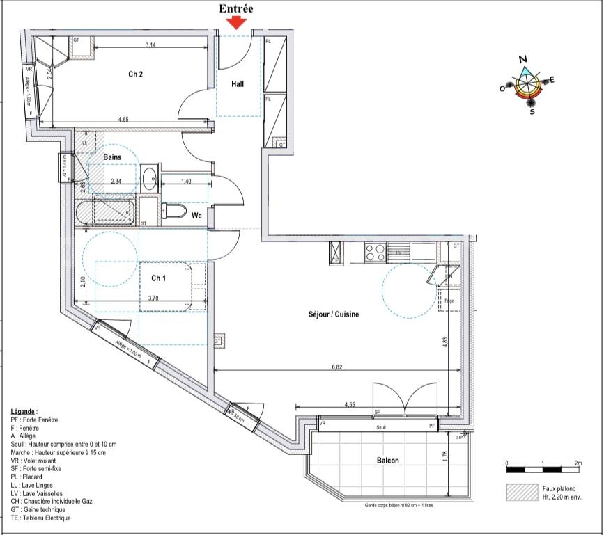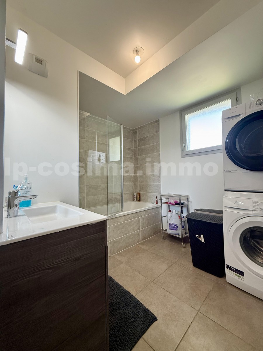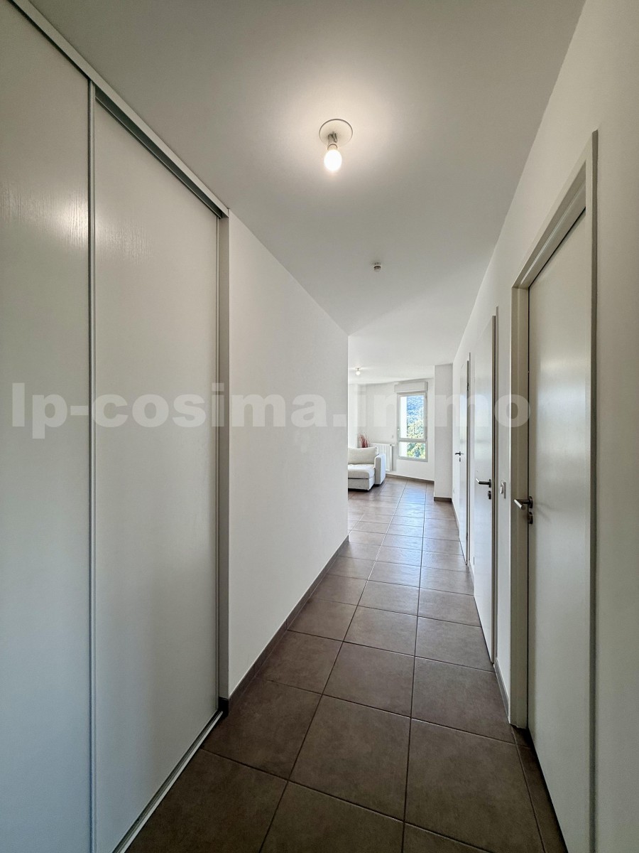 Une entrée avec placard intégré, un grand séjour lumineux avec coin salon et salle à mange ouvert sur la cuisine aménagée et équipée, donnant accès à la terrasse. Deux chambres spacieuses dont 1 avec placard intégré. Une salle de bain ainsi qu'un WC séparé.