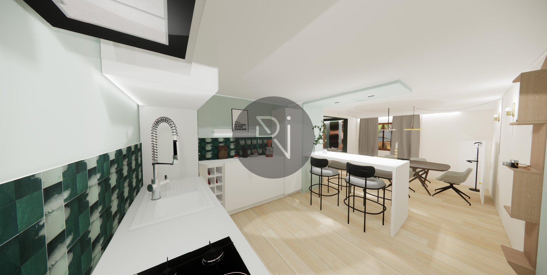 Au niveau 0: une très belle pièce de vie, lumineuse, avec accès terrasse, exposée sud-ouest, cuisine ouverte équipée.