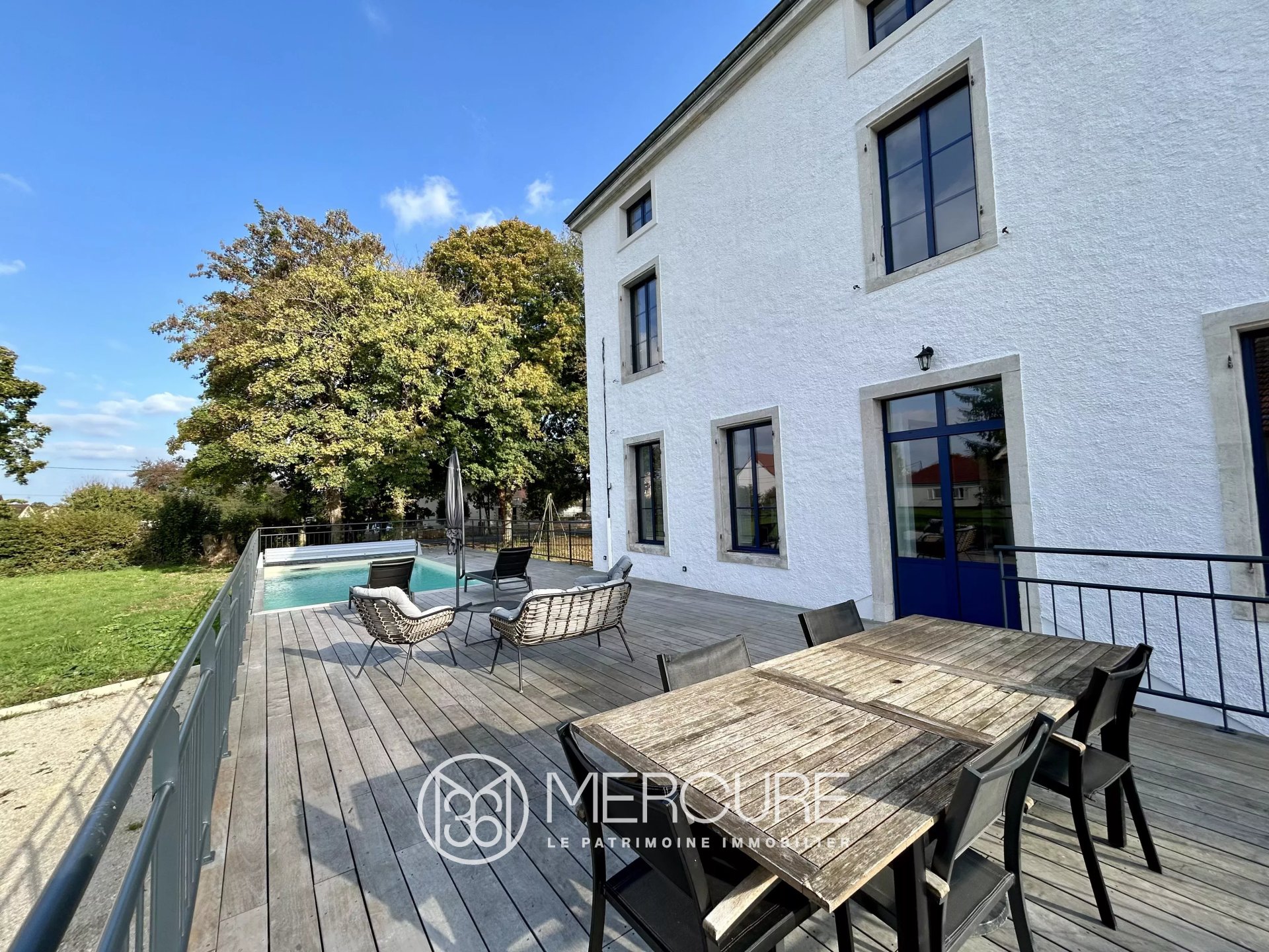 A quelques kilomètres de la ville de Chalon-sur-Saône et des vignobles de la Côte de Beaune, au cœur d’une commune avec commerces, vaste maison de maître entièrement refaite à neuf entre 2023 et octobre 2025 de 362 m² sur 3 niveaux comprenant un séjour avec cave à vins climatisée, une salle à manger, une cuisine américaine toute équipée, 7 chambres, 3 salles de bain/de douche et 3 toilettes. DPE en A exceptionnel. Pompes à chaleur air/air, climatisation réversible sur les 3 niveaux, ballon thermodynamique pour la production d’eau chaude. Vaste terrasse(120 m²) donnant sur une piscine chauffée de 8 x 4 m.
