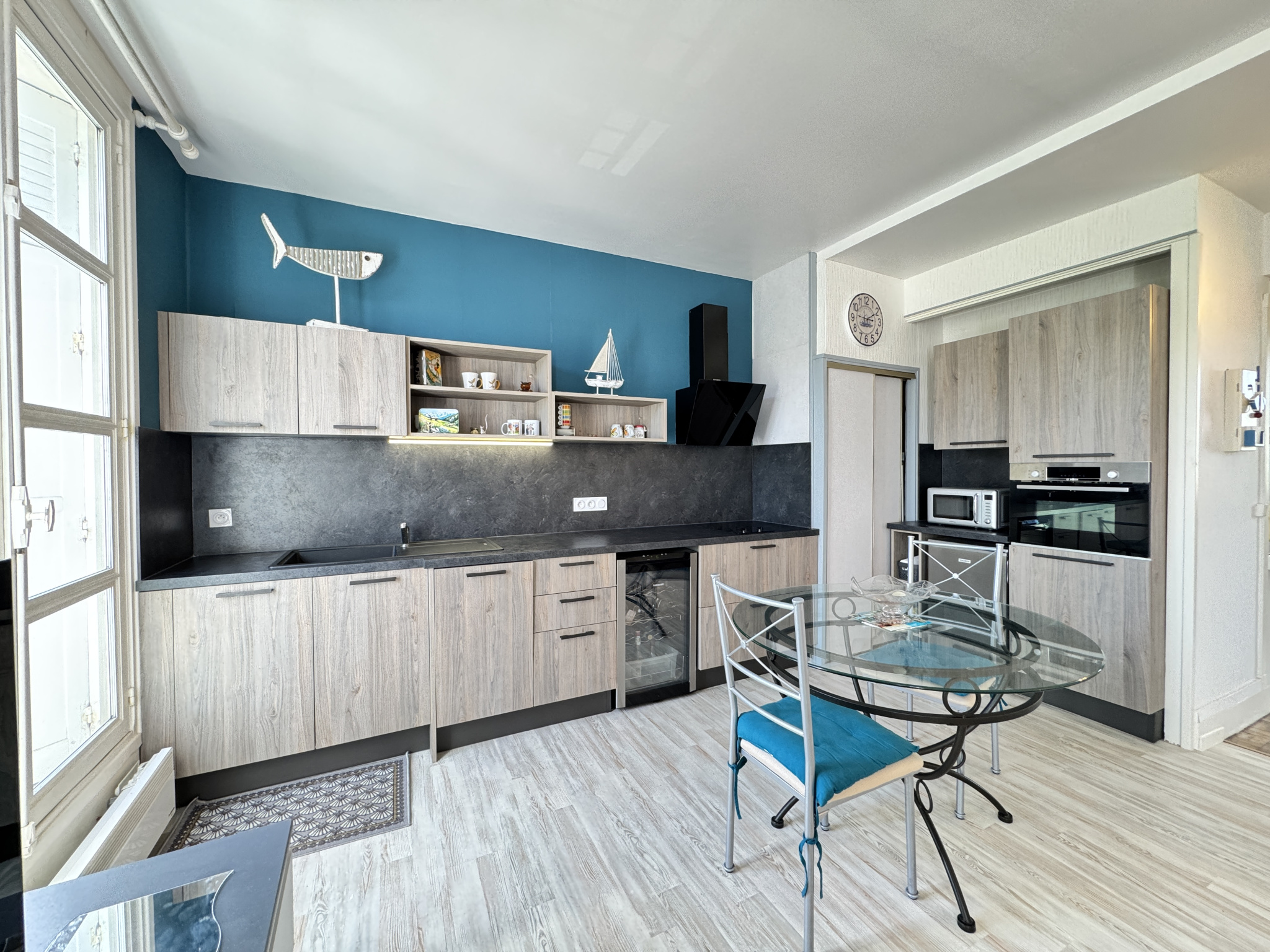 ROYAN (17) - EXCLUSIVITE MONNEREAU IMMOBILIER ROYAN. Idéalement situé en plein centre ville de Royan, à seulement 150 mètres de la plage et autant du marché, cet appartement au deuxième étage offre un cadre de vie privilégié entre dynamisme urbain et douceur balnéaire. Entièrement renové avec soin, il se distingue par son état impeccable et ses belles prestations. Avec une surface de 41,41 m2 loi Carrez, il dispose d'une pièce de vie lumineuse avec sa cuisine équipée quasi neuve et d'une chambre indépendante avec grand placards/dressing. Petite salle d'eau, wc séparé. Niché dans un immeuble typique de la reconstruction, il est très bien entretenu. Espace dans les communs pour les vélos. Petite copropriété constituée de 4 lots. Association syndicale sans frais. Et les deux cent sept millièmes de la propriété du sol et des parties communes générales.