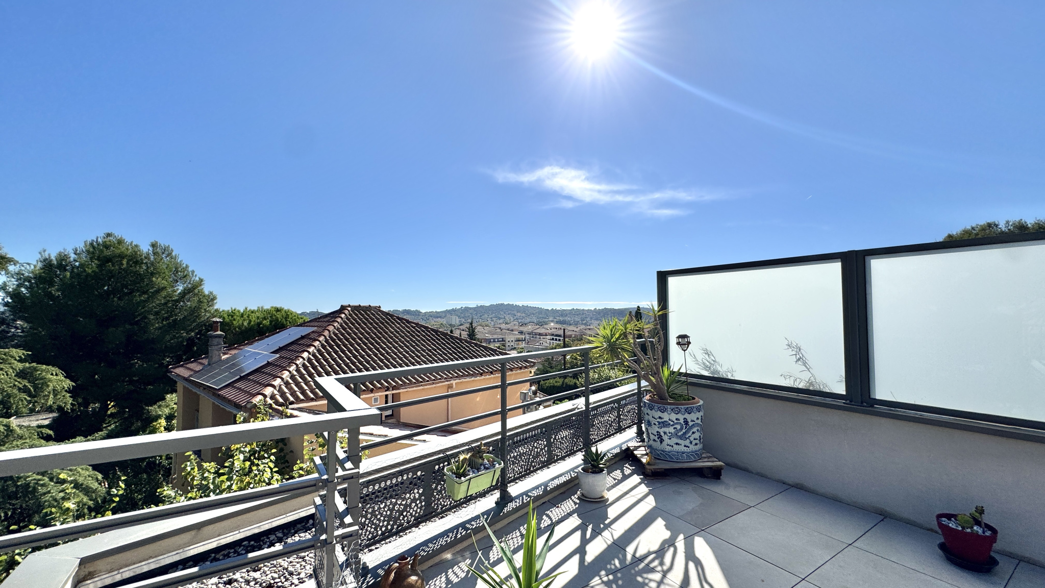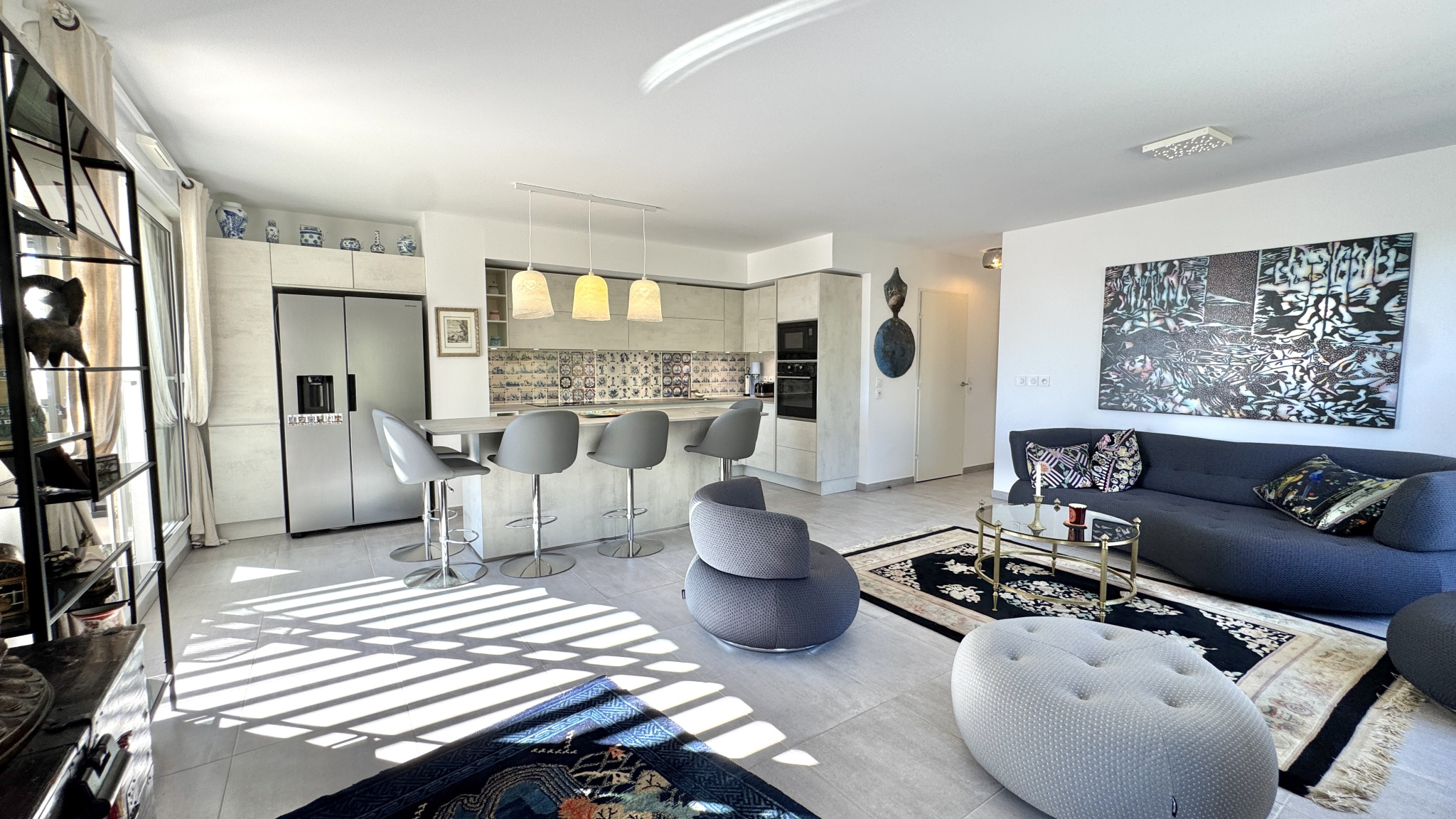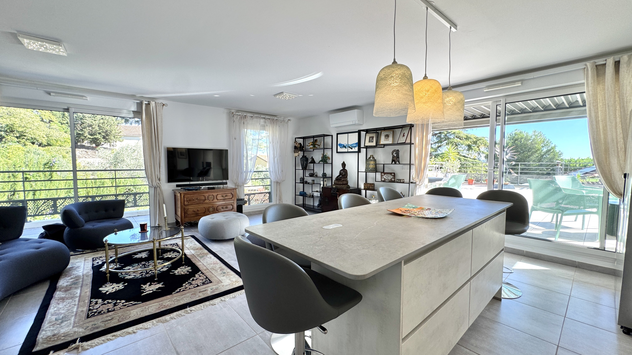 L'espace à vivre d'environ 40 m2 très lumineux avec sa cuisine ouverte entièrement aménagée et équipée s'ouvre sur une splendide terrasse d'environ 70m2 plein sud avec vue panoramique, dotée d'une pergola bioclimatique de 20m2 et ses 3 stores occultants avec éclairage intégré vous permettant d'en profiter du printemps à l'automne. Côté cuisine, un cellier/buanderie est adjacent.