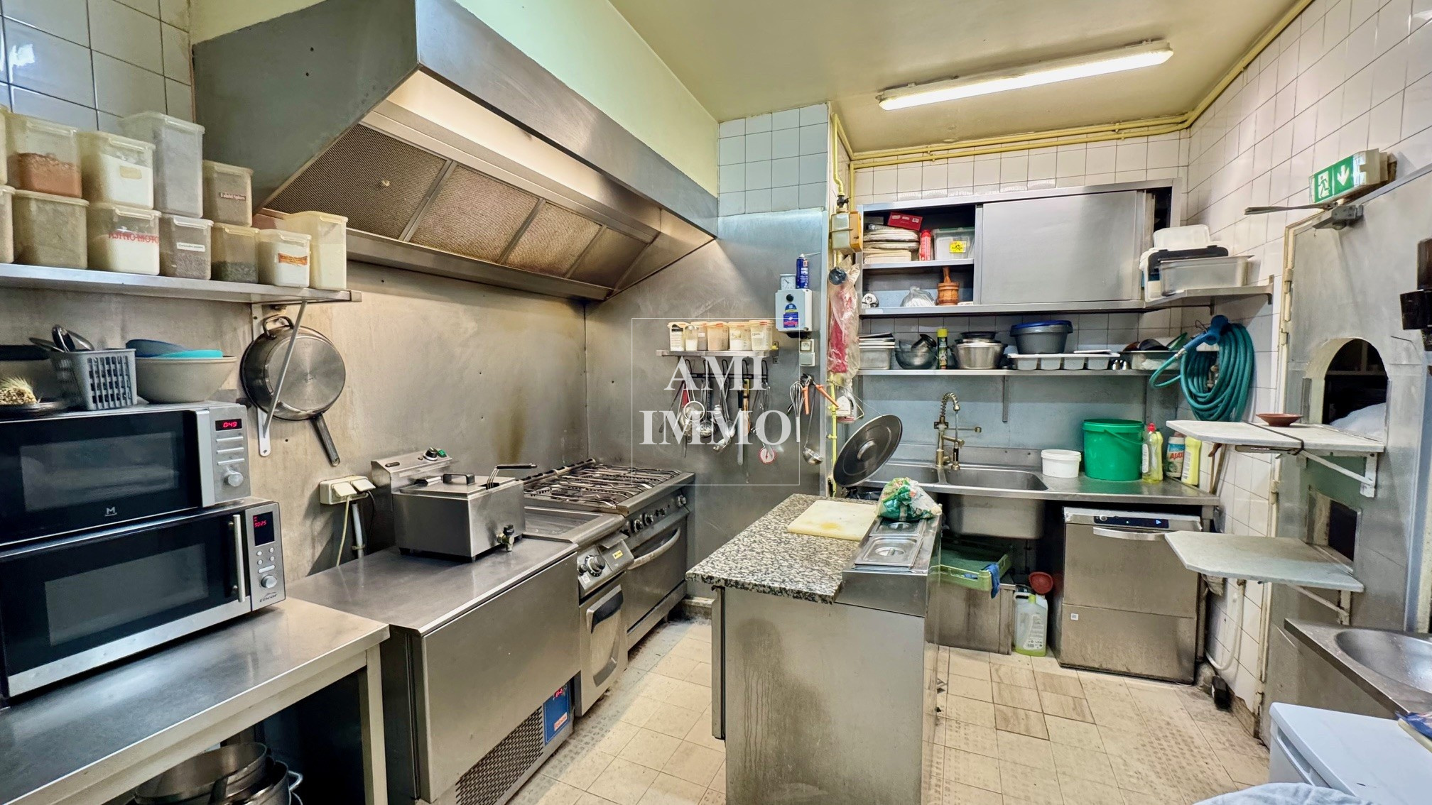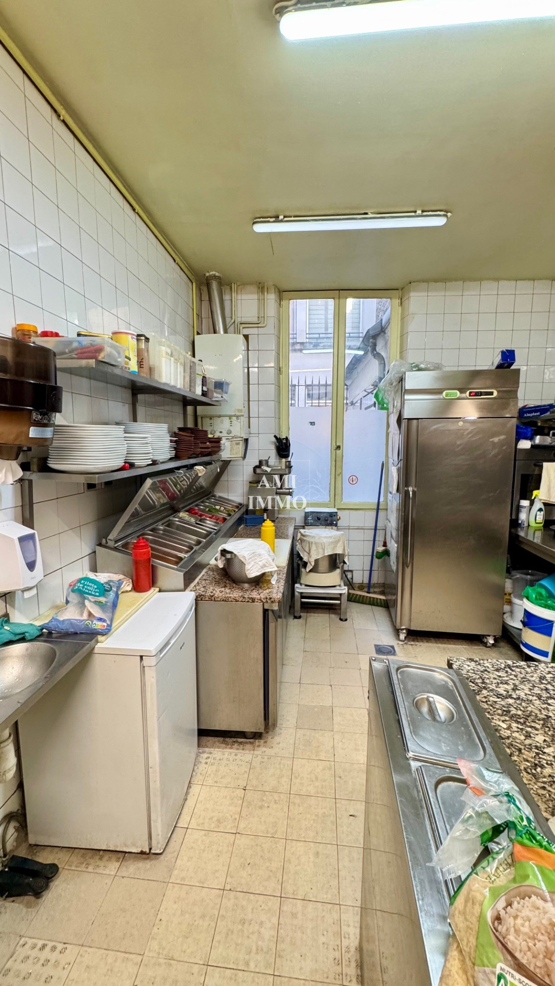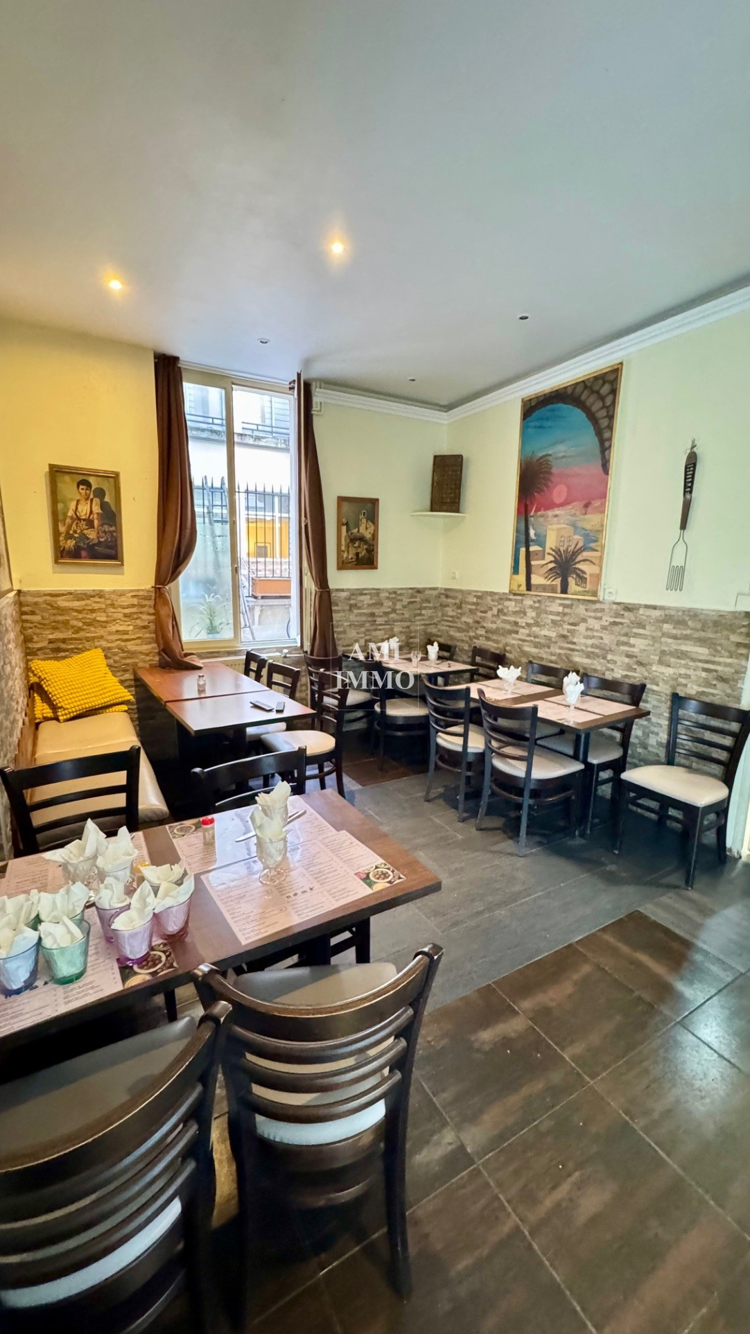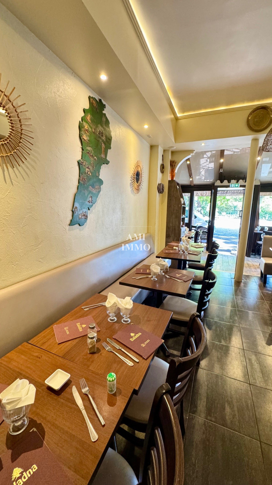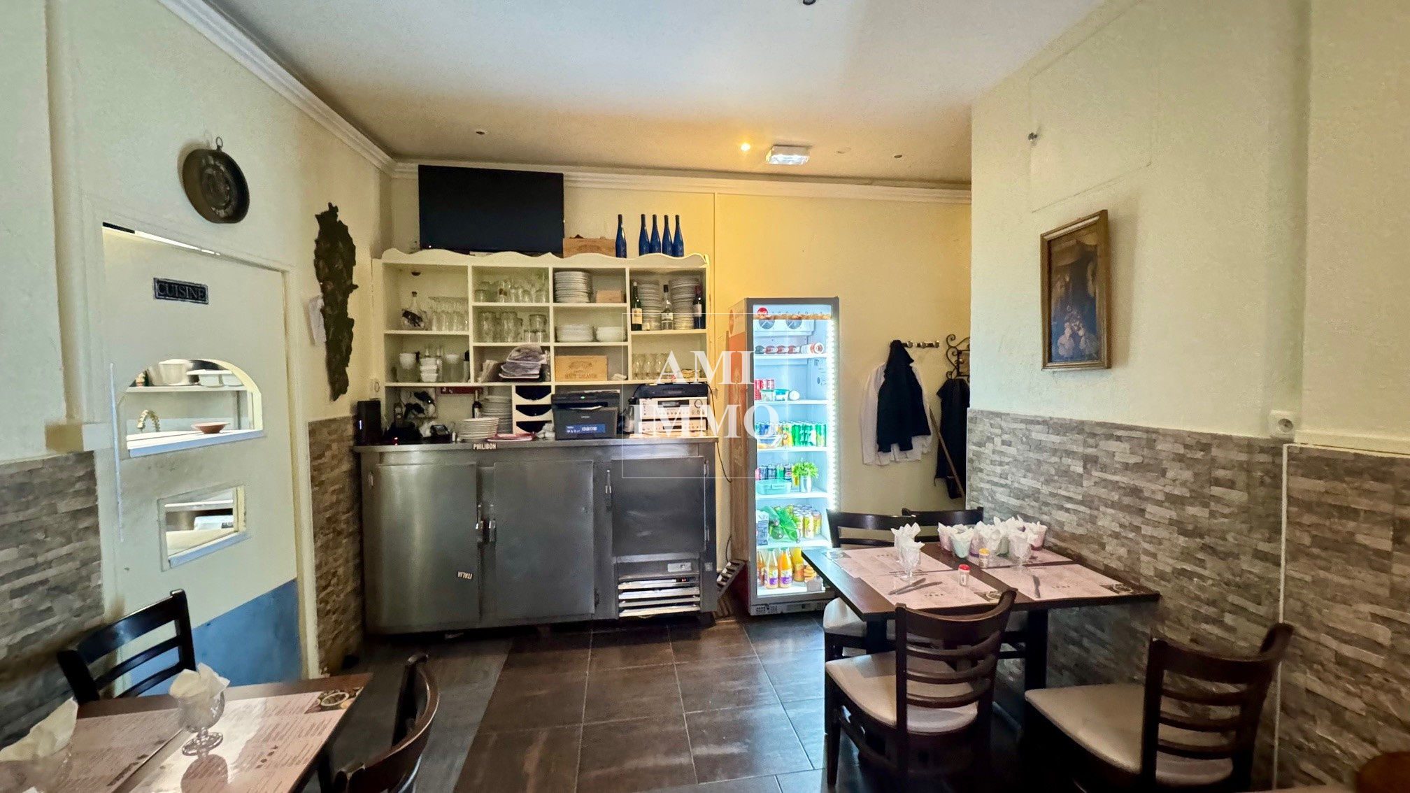 L'établissement, d'une capacité de 60 couverts en rez-de-chaussée (accès PMR), se compose d'une terrasse couverte, d'une première salle avec comptoir, d'un couloir distribuant une seconde salle ainsi qu'une cuisine équipée avec passe-plat. Une cave en sous-sol abrite une chambre froide et un espace de stockage fonctionnel.