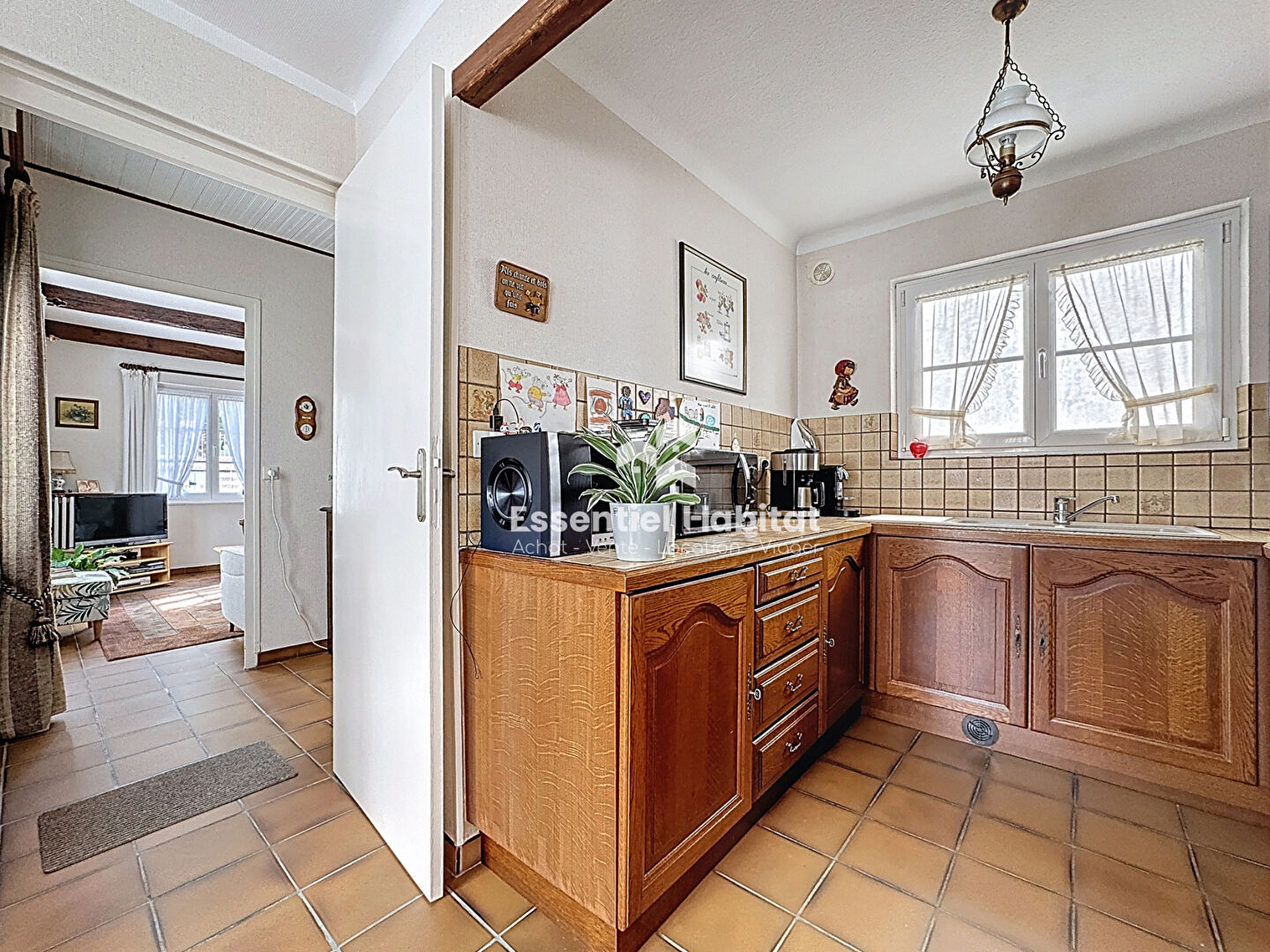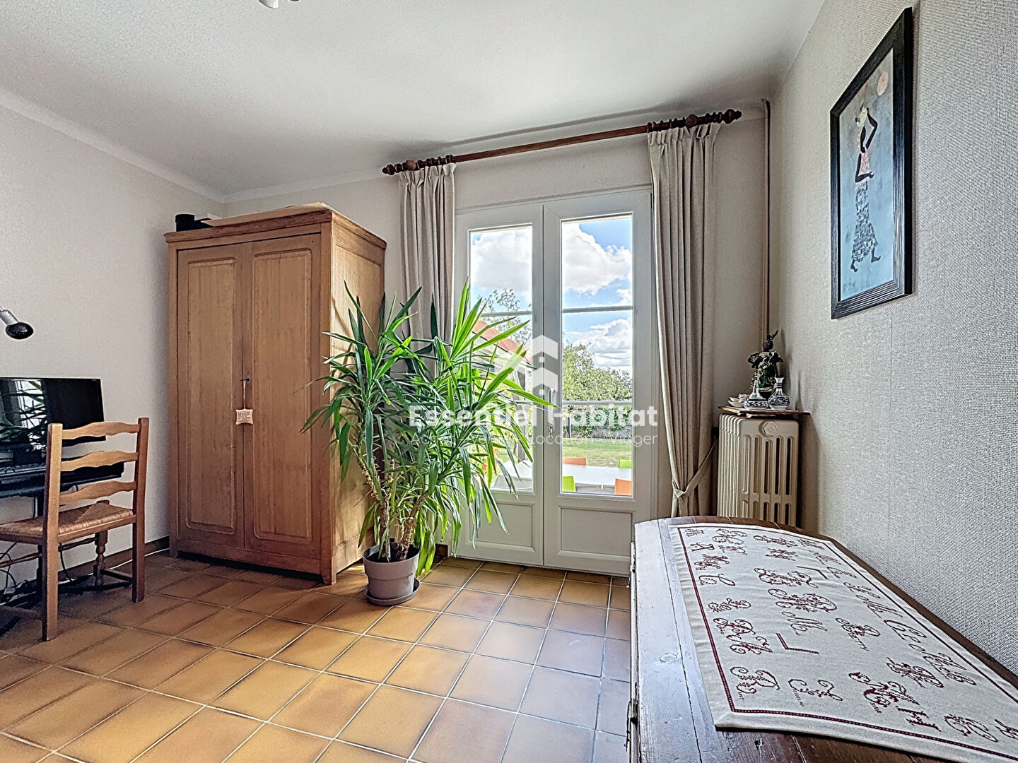 Entrée, salon avec sa cheminée à foyer ouvert, cuisine ouverte sur une salle à manger très lumineuse, 1 chambre avec rangement, un toilette, une salle d'eau, une pièce bureau avec accès terrasse et jardin, un grand garage avec rangement et une cuisine d'été donnant également accès sur la terrasse et le jardin.
